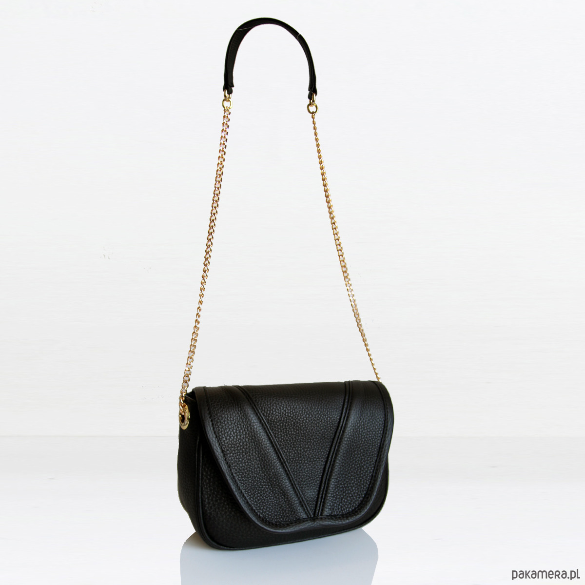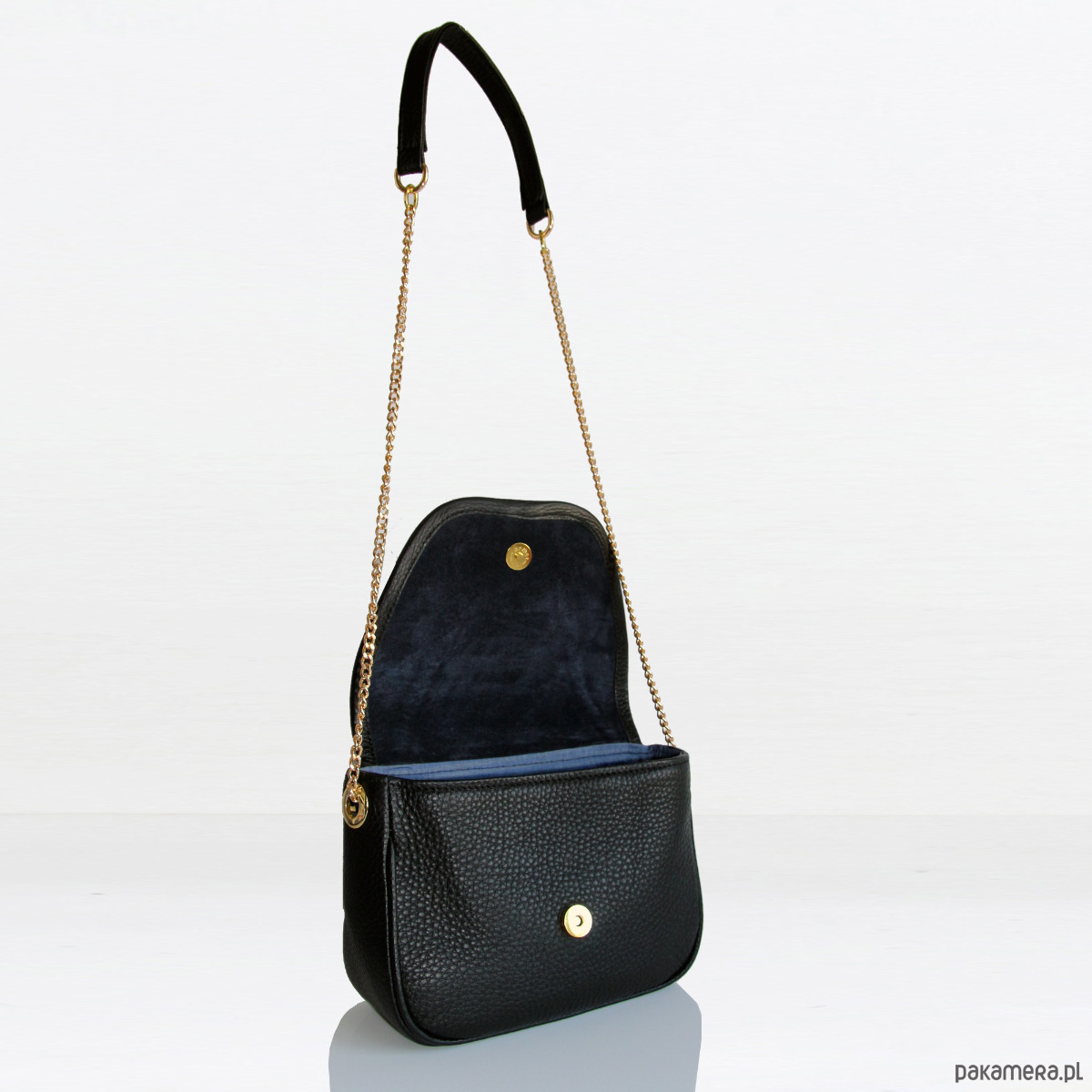 Mała torebka na ramię typu "chanel" w kolorze czarnym - skóra naturalna licowa o strukturze groszku. Torebka zamykana jest na magnes. Zdobiona złotymi mocowaniami i złotym łańcuszkiem. W środku wykończona skórą w tym samym kolorze oraz płócienną podszewką. Wewnątrz kieszeń zamykana na suwak. Długość łańcuszka z naramiennikiem to 115 cm. Cudowna na prezent!