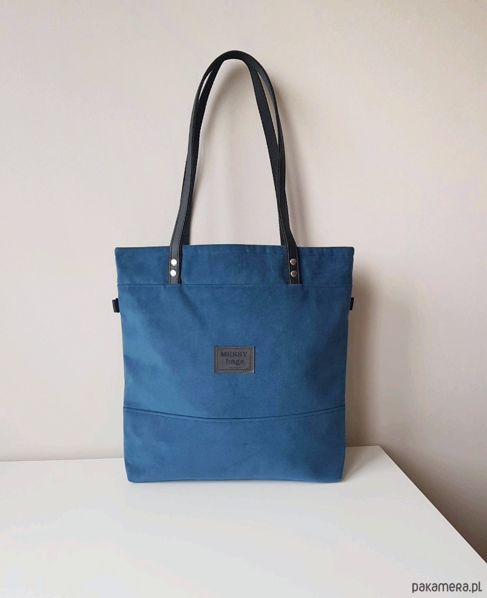 Torebka typu shopper bag. W całości wykonana z tkaniny obiciowej o welurowym wykończeniu w niebiesko- morskim kolorze.