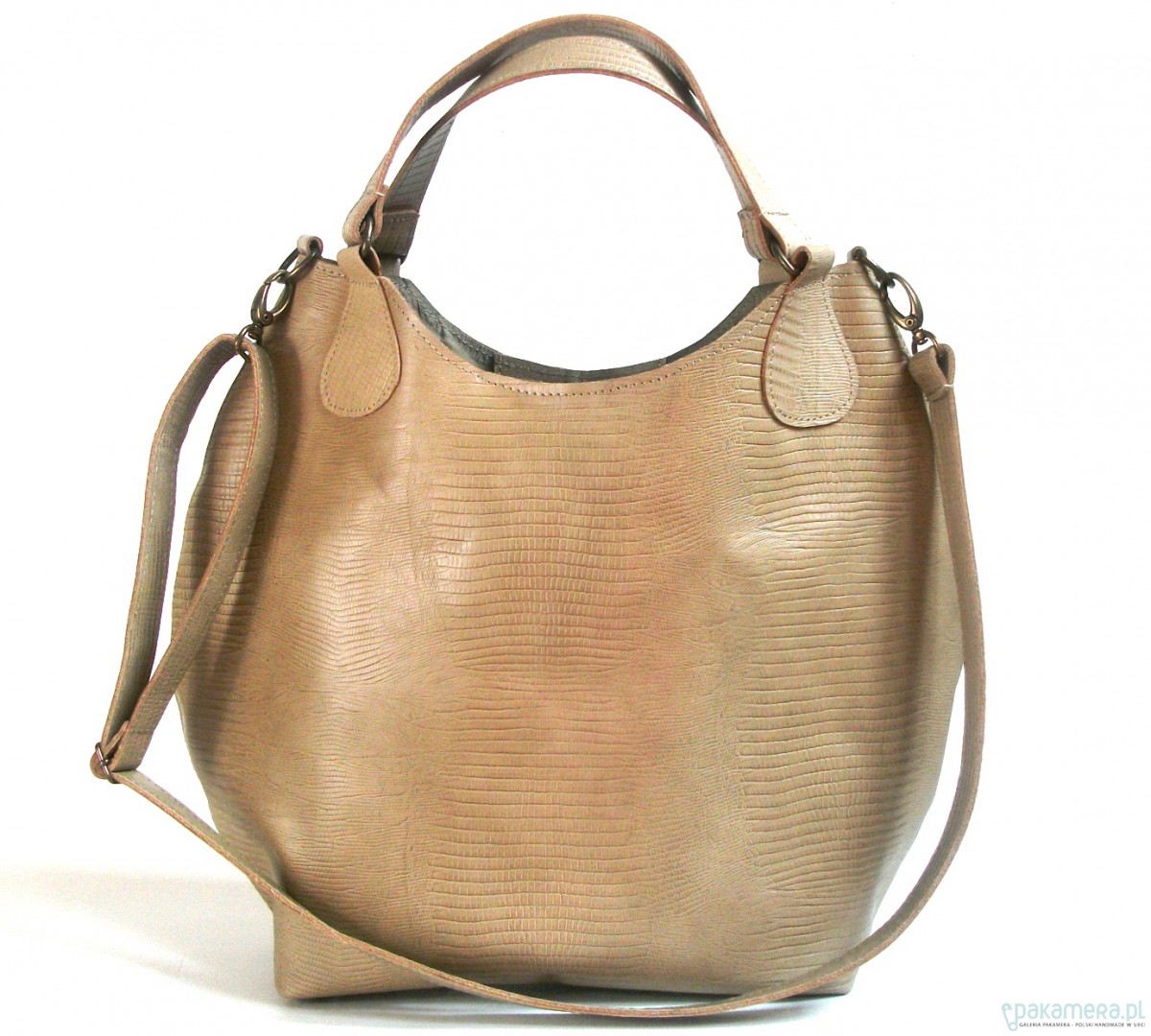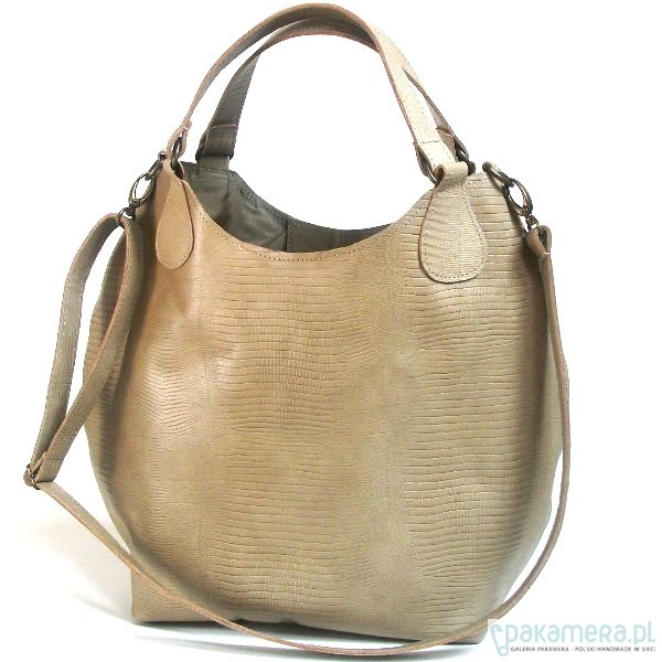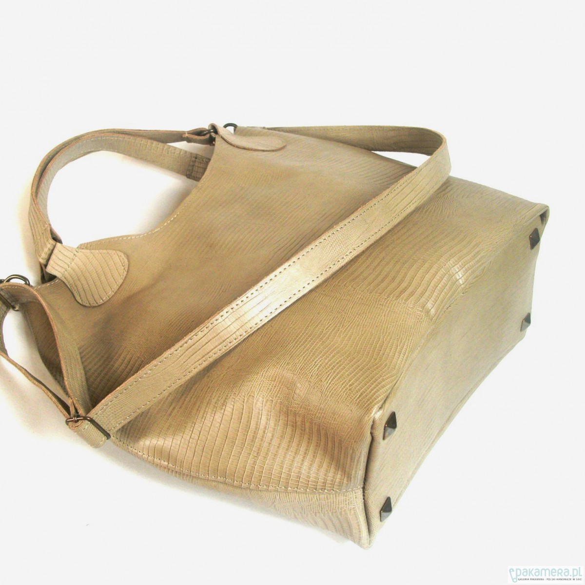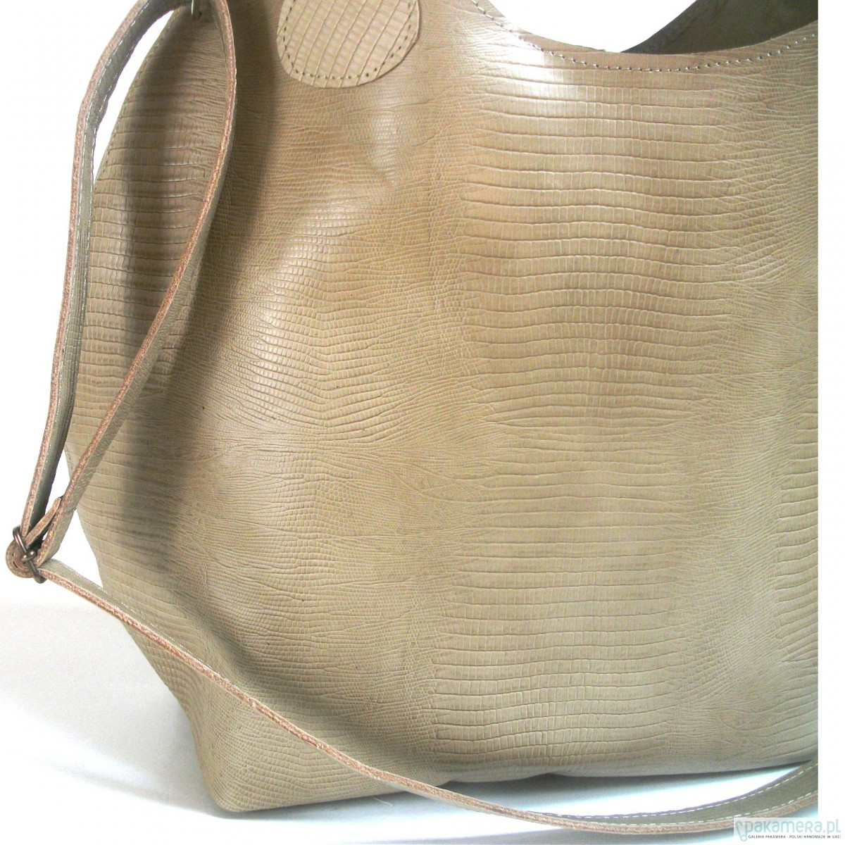 Duża torba uszyta ze skóry naturalnej fakturowanej w jaszczurkę/węża w piaskowym oddcieniu beżu. Skóra dosyć sztywna. Torba wewnątrz wyłożona podszewką, zapinana na magnes, , wewnątrz 2 kieszonki na telefon i jedna na zamek. Torba do noszenia w ręku i na ramieniu (doczepiany skórzany pasek o szer. 2,5 cm i regul. dł. - można nosić na skos), okucia ciemno złote. Wys. 31 cm, szer. na środku 38 cm, gł 13 cm.