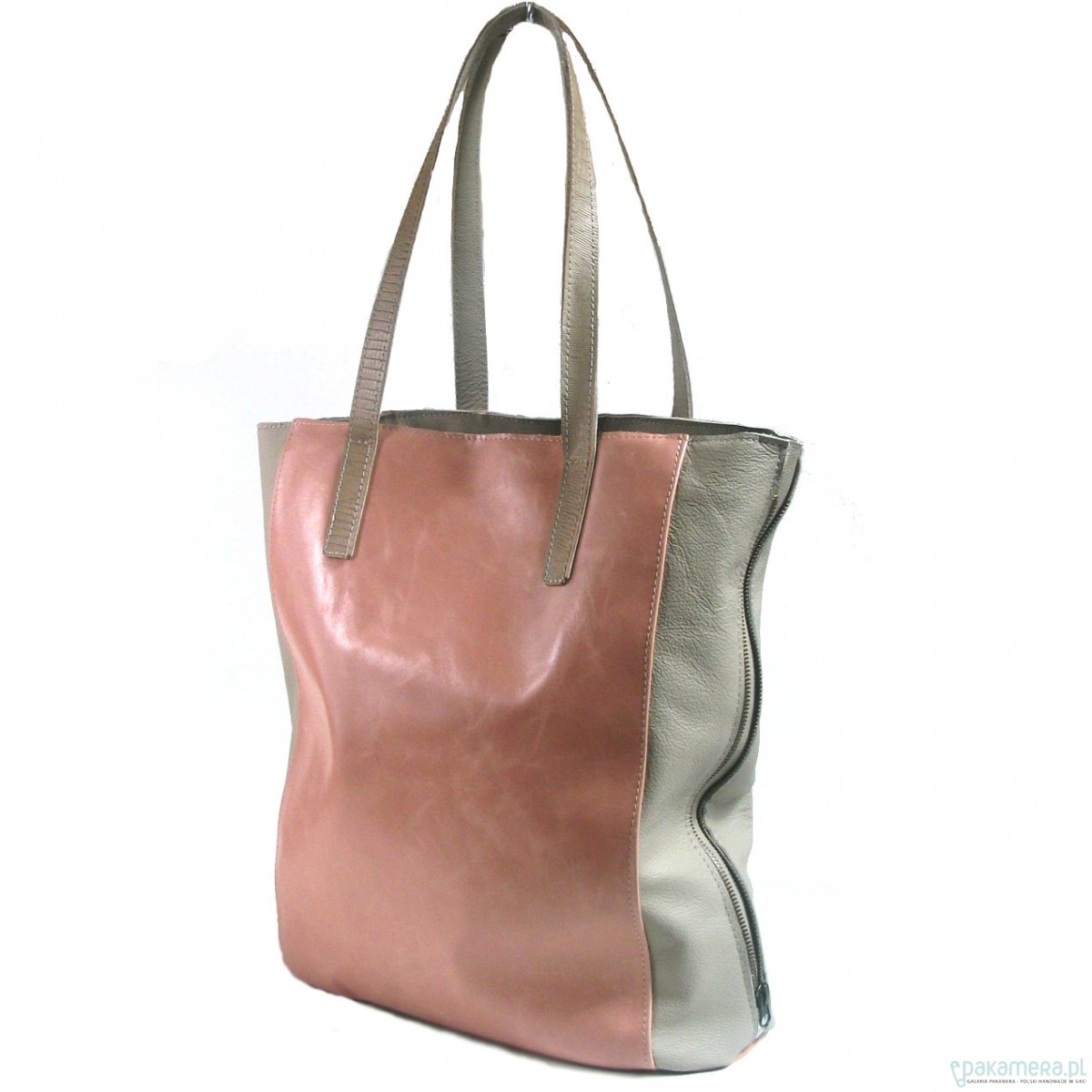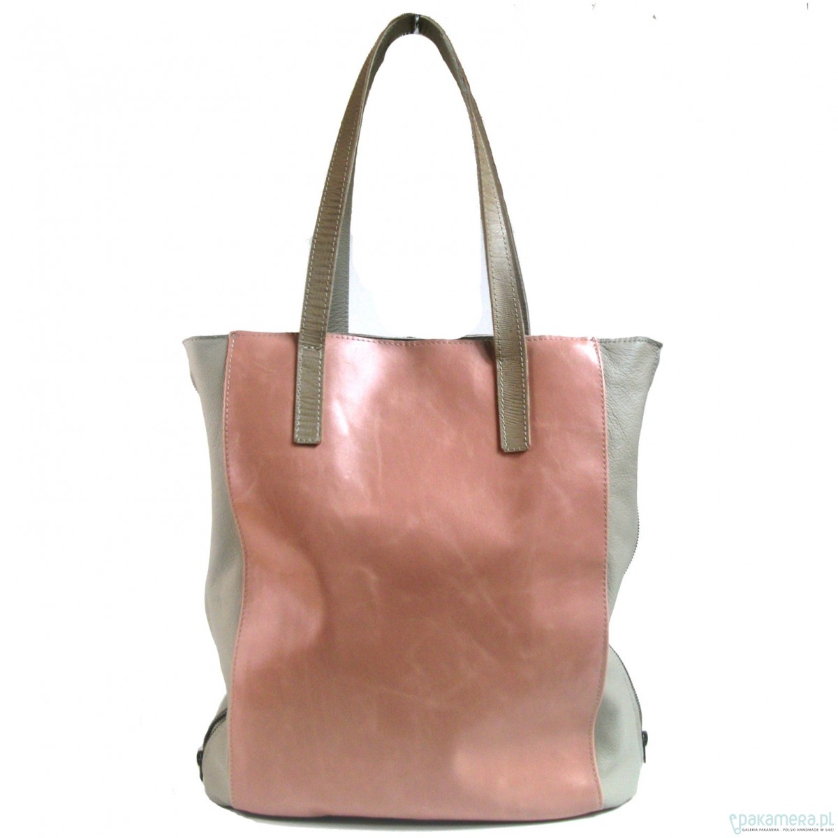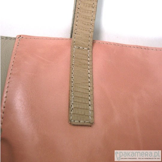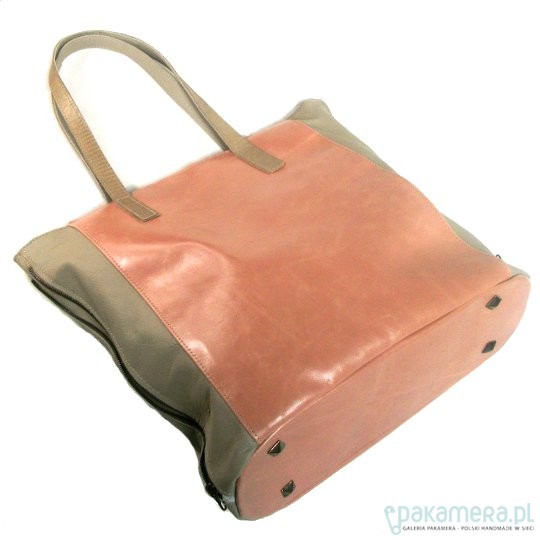 Duża skórzana torba. Przód i tył uszyty ze skóry w kolorze brudnego różu, gładkiej, boki w kolorze chłodnego beżu, skóra z lekką fakturą, w lekki groszek. Po bokach dekoracyjne zamki. Okucia oksydowane. Dno usztywnione, na dnie pukle. Zapinana na zamek, wyłożona beżową podszewką, wewnątrz 1 kieszeń na zamek i 2 na telefony. Uchwyty naszyte na płasko z dekoracyjnej wytłaczanej skóry w kolorze beżowym, też skórzane, do noszenia ciasno na ramieniu. Wymiary: wysokość 38 cm, szer. 34 cm, gł. 13 cm. Polecam, piękna i efektowna.