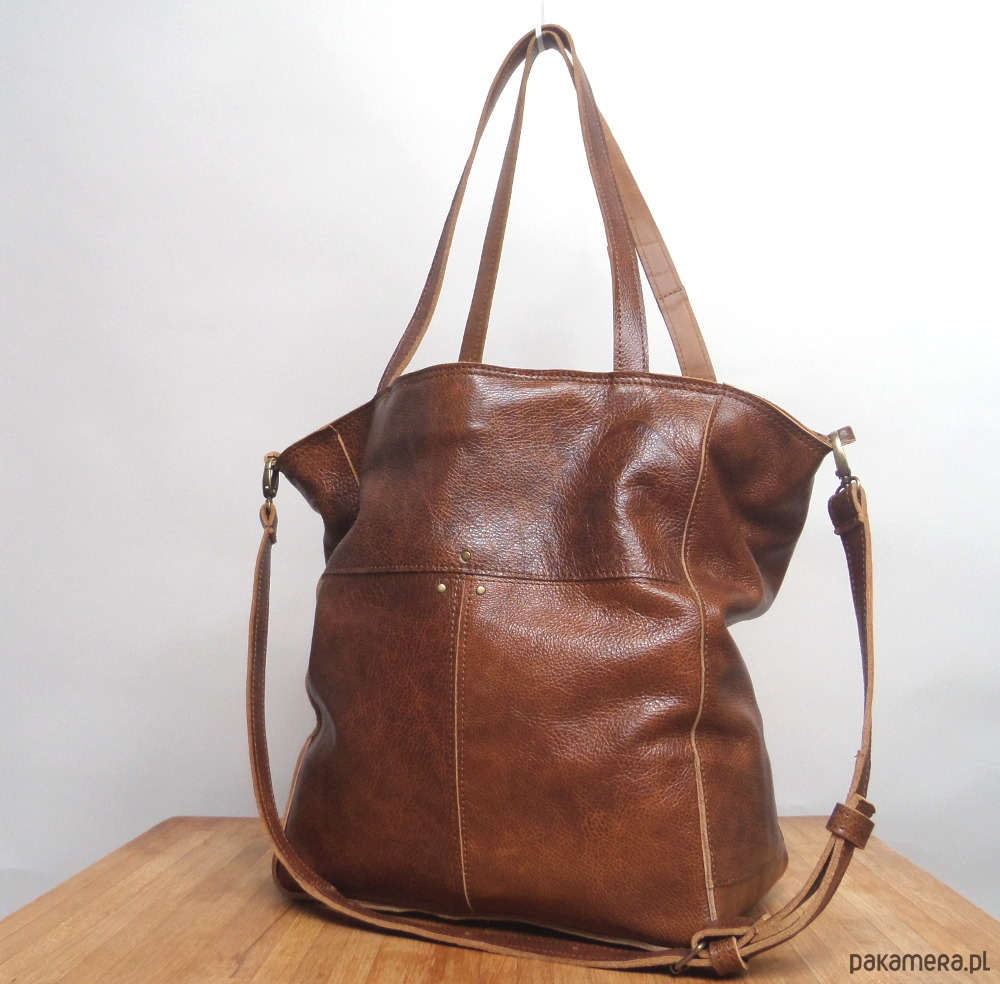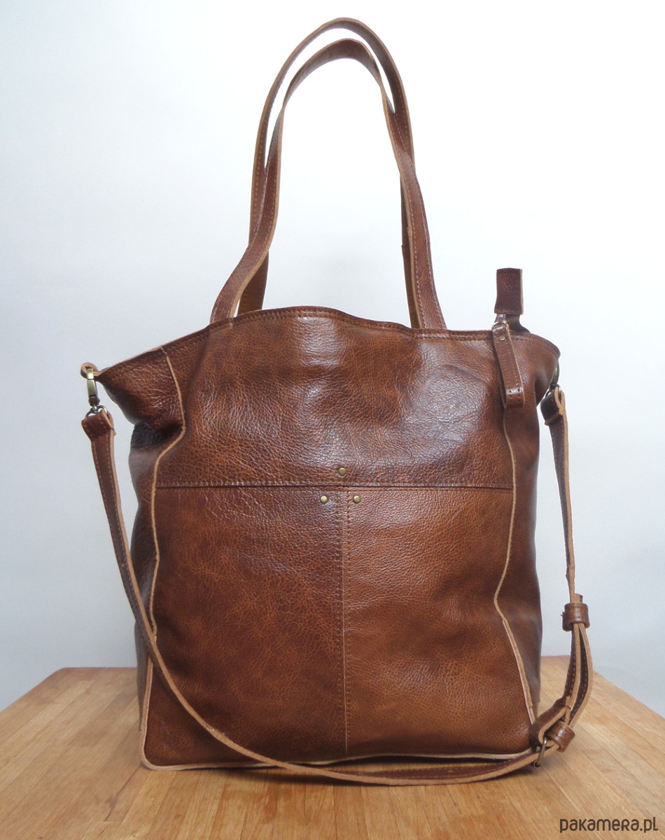 Duża uszyta ze skóry naturalnej, w kolorze ciemno bursztynowym. Przód i tył dekoracyjnie przestebnowany i wykończony ciemno złotymi nitami. Z tyłu zewnętrzna kieszeń na zamek.