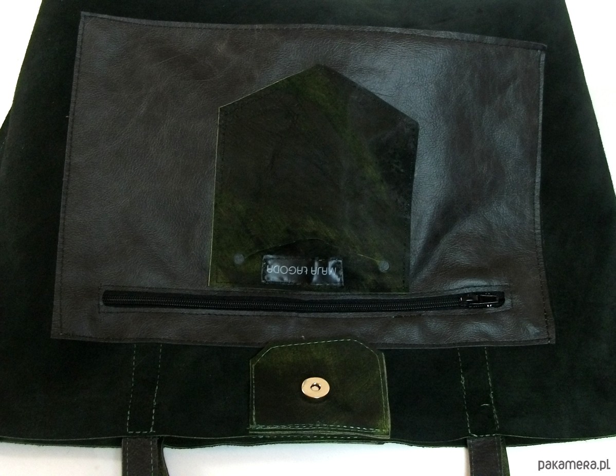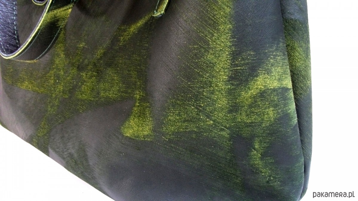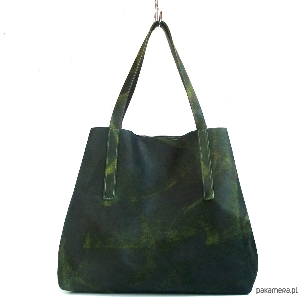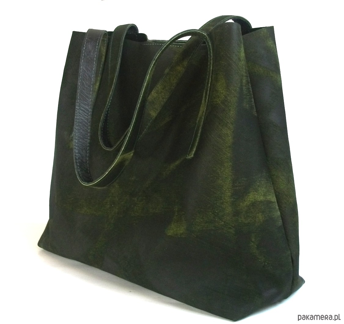 Duża skórzana torba, uszyta z naturalnej skóry w kolorze ciemno zielonym przecierana, tak że widać jaśniejszą zieleń. Zapinana na magnes. Bez podszewki, wewnątrz kieszeń na zamek i mniejsza na telefon. Do noszenia na ramieniu na podwójnych uchwytach (dł. ok 50 cm) Wymiary: wys. 34 cm, szer. 45 cm, gł. 14.