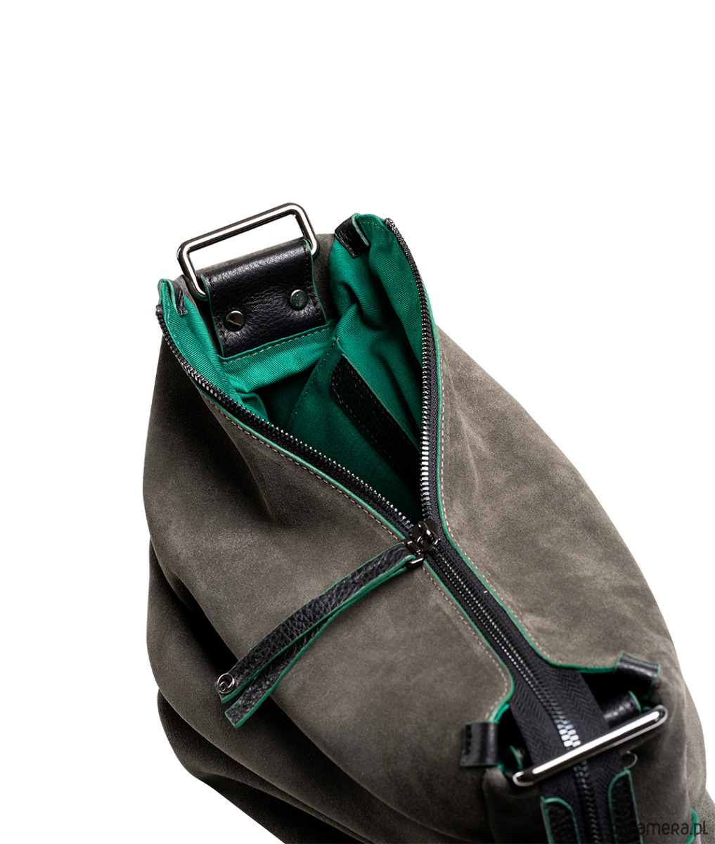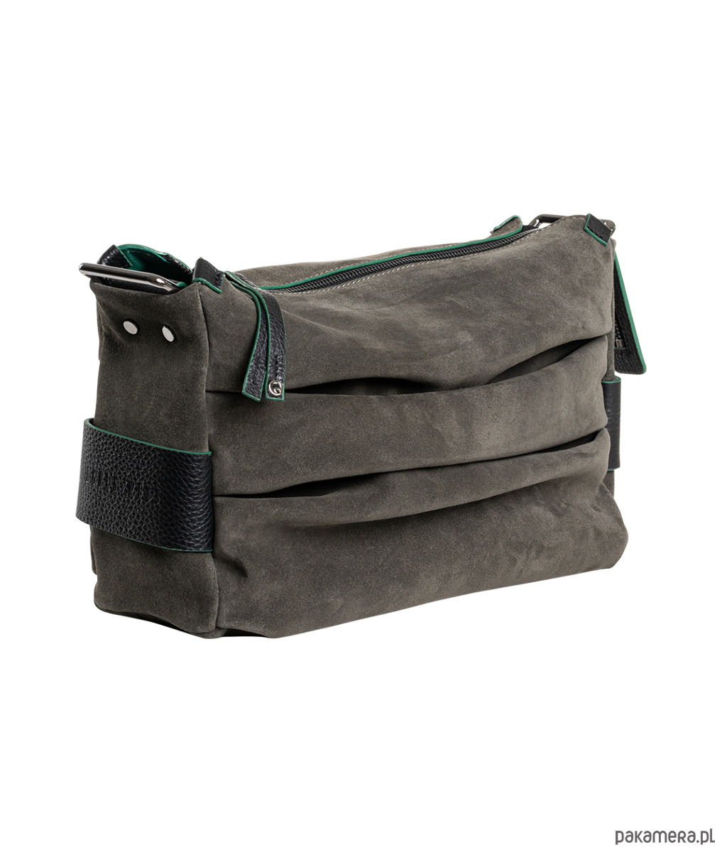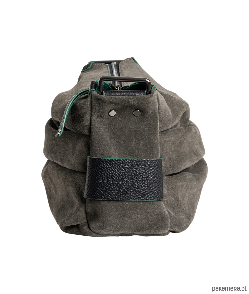 Baza Cameleobag. Wykonana z szaro-zielonego zamszu, zamykana na suwak. Wewnątrz, jedna duża kieszeń. Wnętrze wykończone zieloną podszewką. Wszystkie okucia w kolorze ciemnego niklu. Brzegi malowane na zielono.