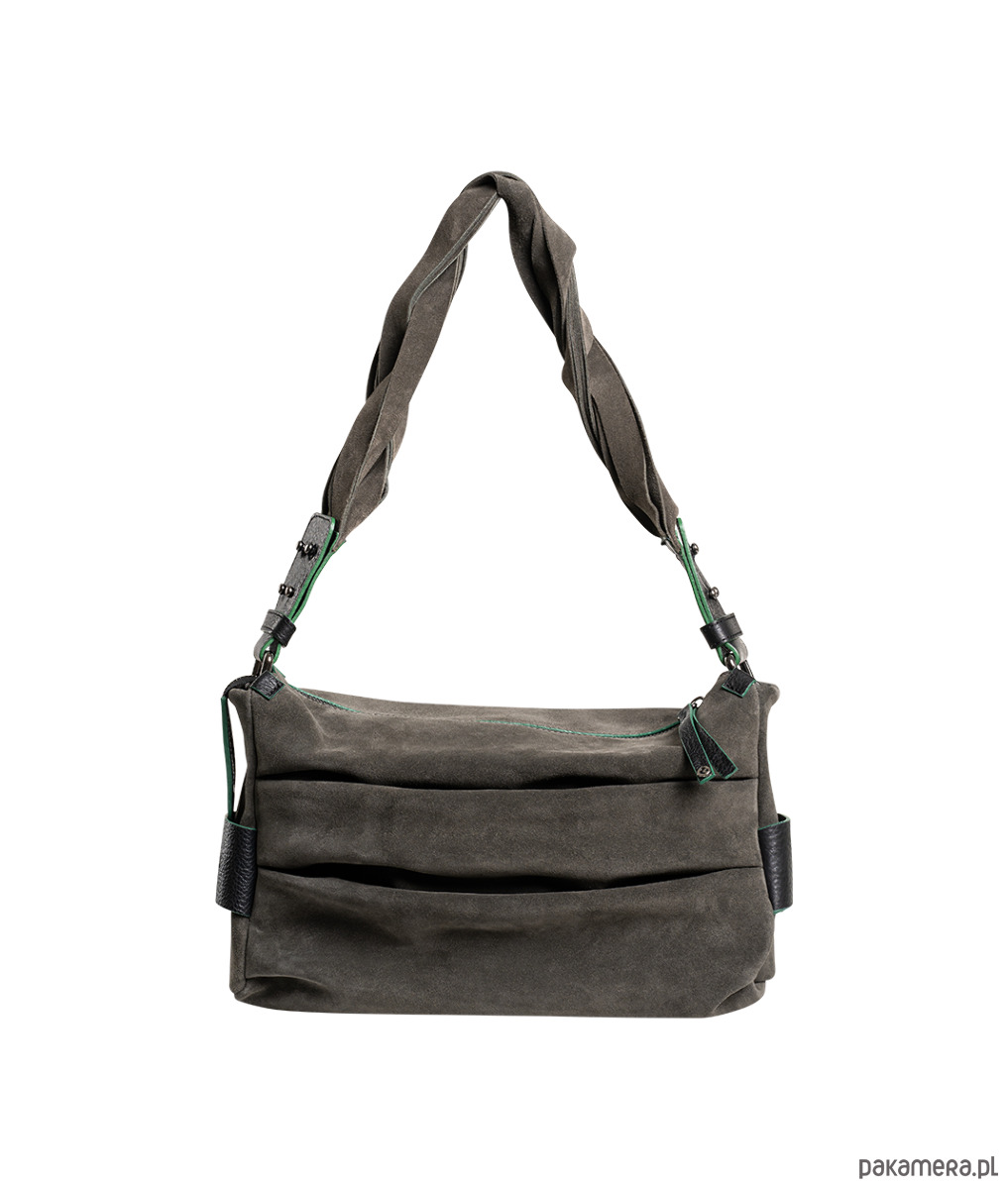 Wymienny, krótki pasek wykonany ze skóry i zamszu. Końcówki z czarnej skóry, połączone są skręconymi paskami z szaro-zielonego zamszu. Okucia w kolorze ciemnego niklu.