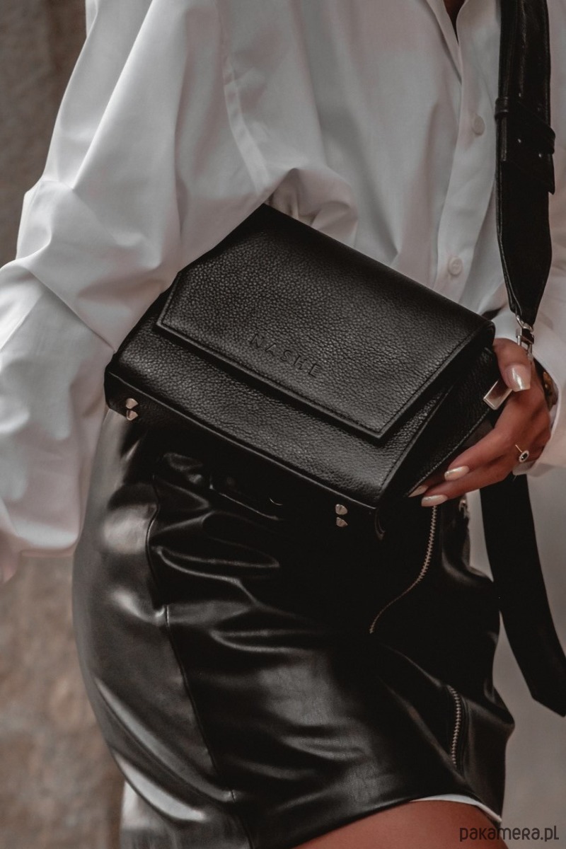Torebka typu crossbody została uszyta ze skóry naturalnej o groszkowej fakturze.