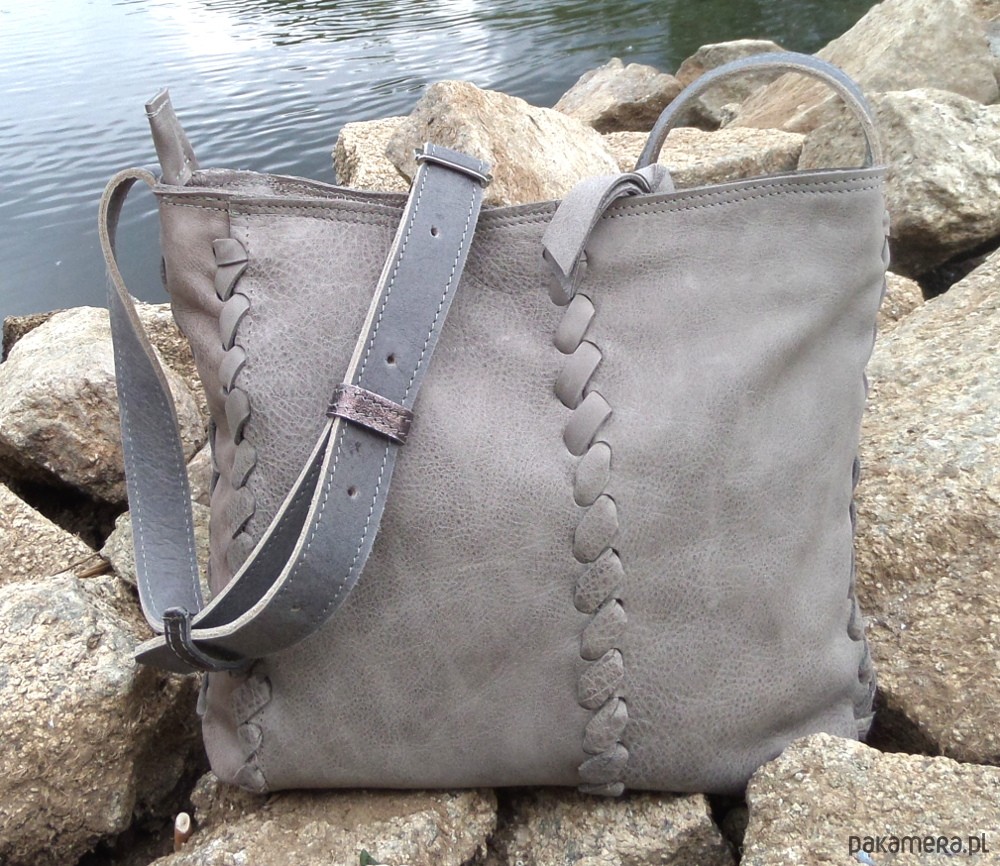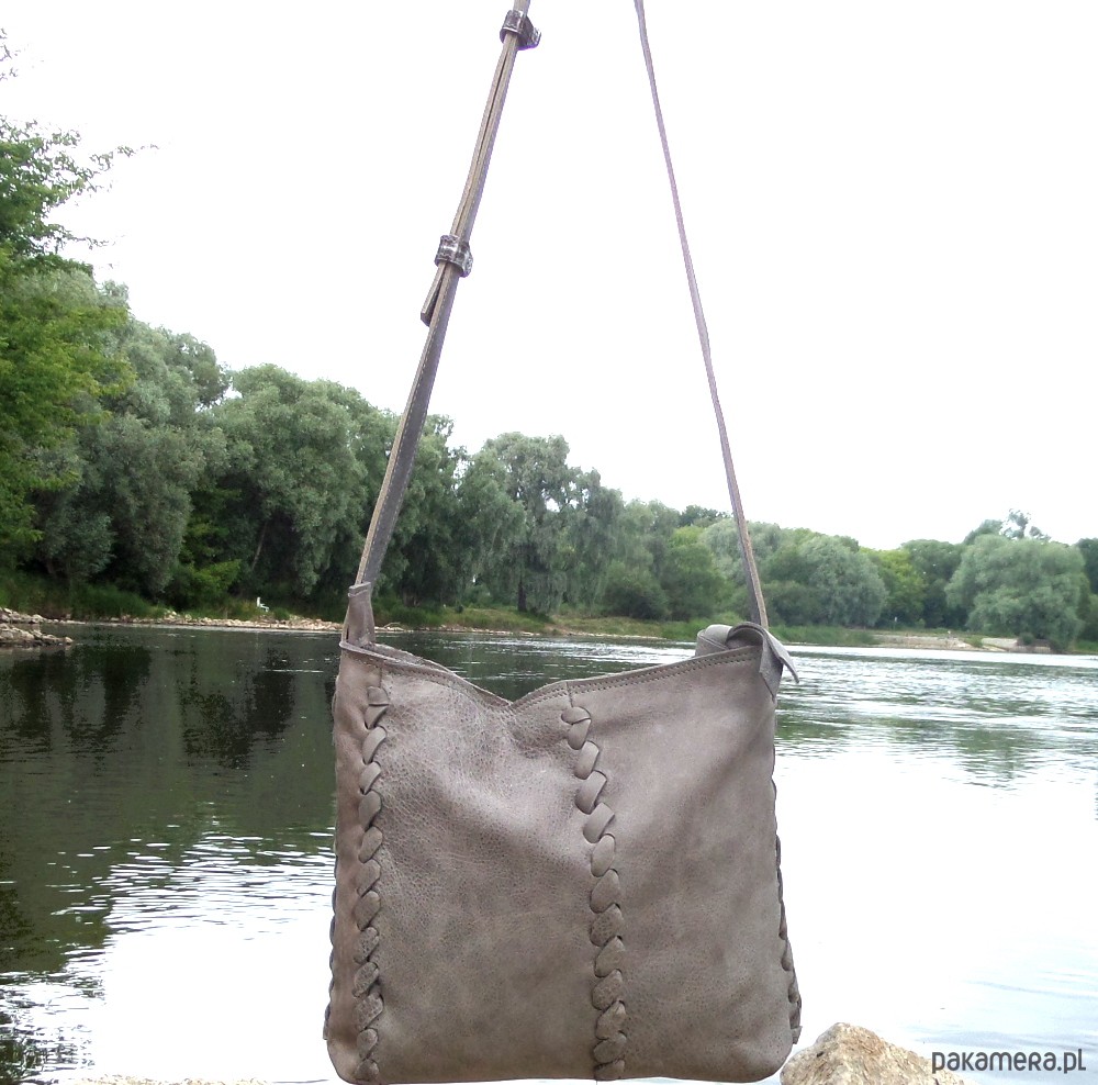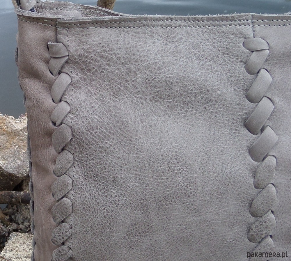Szara skórzana torebka średniej wielkości. Ozdobiona z przodu, z tyłu i po bokach sznurowaniami. Skóra naturalna - miękka, mięsista w świetnym bardzo uniwersalnym kolorze.