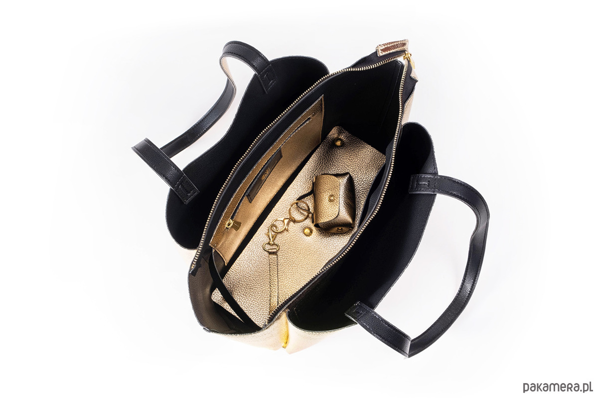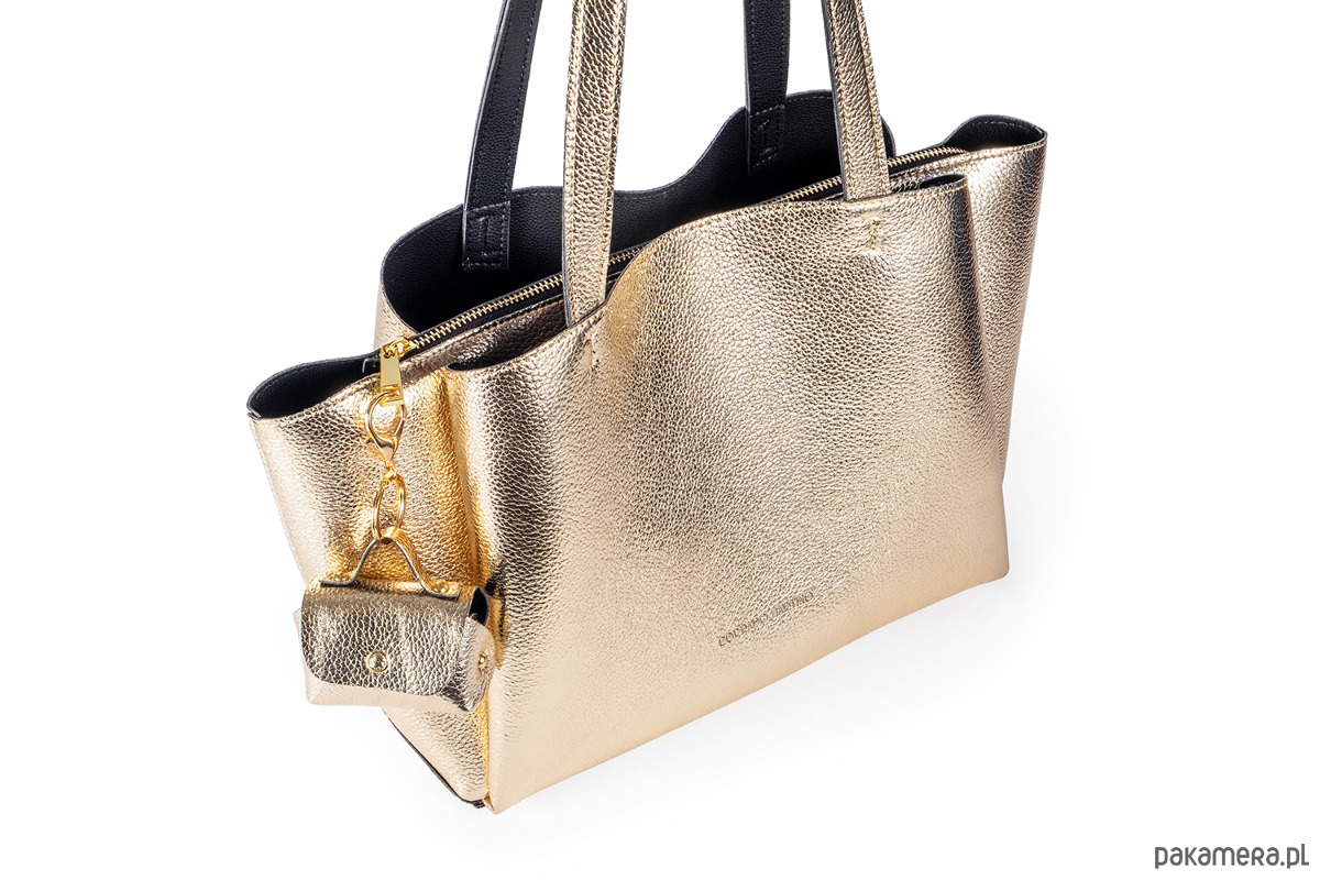 Torebka shopper uszyta z dwustronnej skóry ekologicznej, materiał ten jest wodoodporny, wegański, bardzo przyjemny w dotyku i trwały. Występuje w różnych wariantach kolorystycznych czarno- złotym i czarno-srebrnym każdy zachwyca swą oryginalnością.