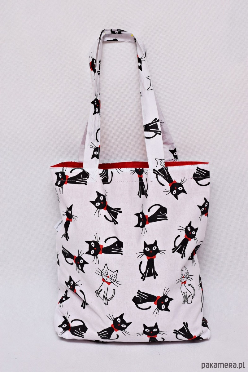 Ekologiczna torba na zakupy uszyta z bawełny 100% z motywem w koty z muszką i bawełnianą czerwoną podszewką.