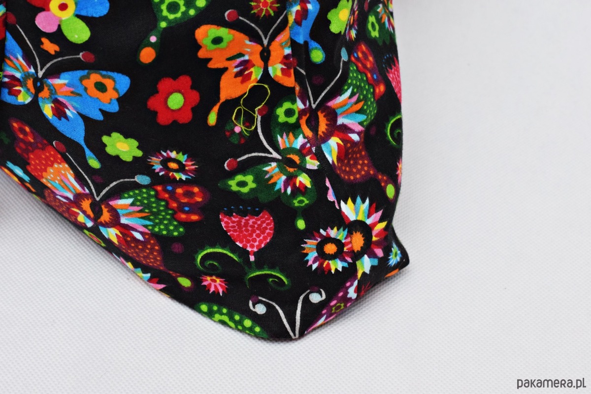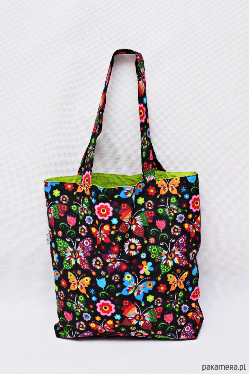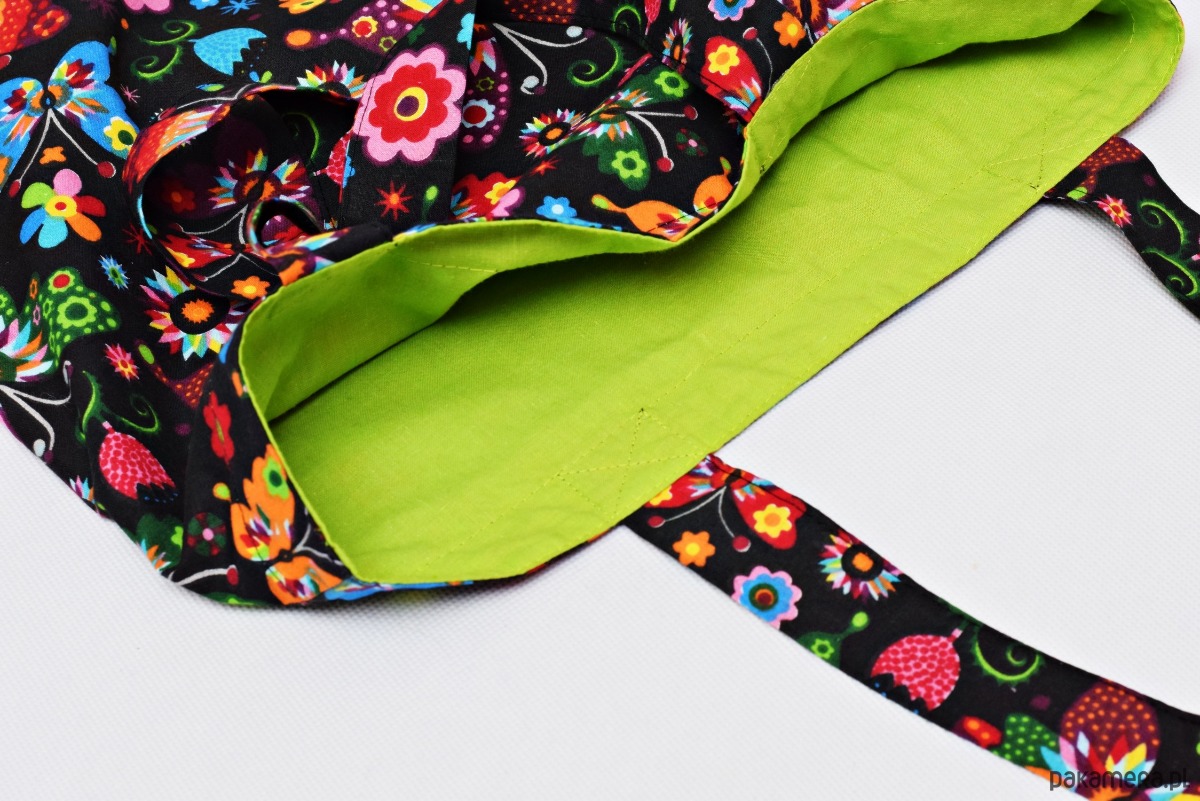 Ekologiczna torba na zakupy uszyta z bawełny 100% z motywem w motyle na czarnym tle w stylu ludowym folk i bawełnianą podszewką w kolorze zielonym.