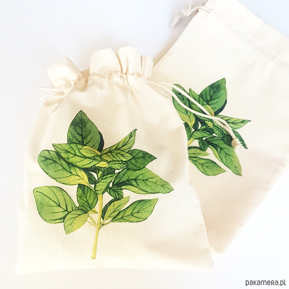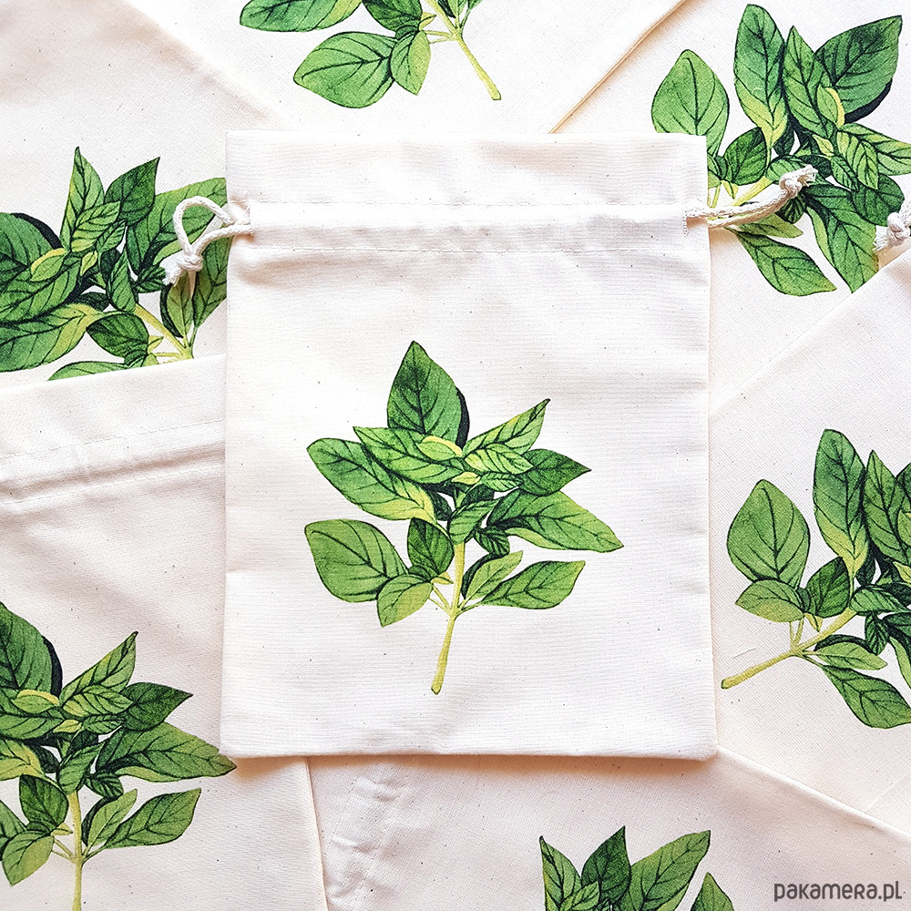 Bawełniany woreczek zero waste z motywem bazylii. Autorski nadruk stworzony z akwarelowej ilustracji.