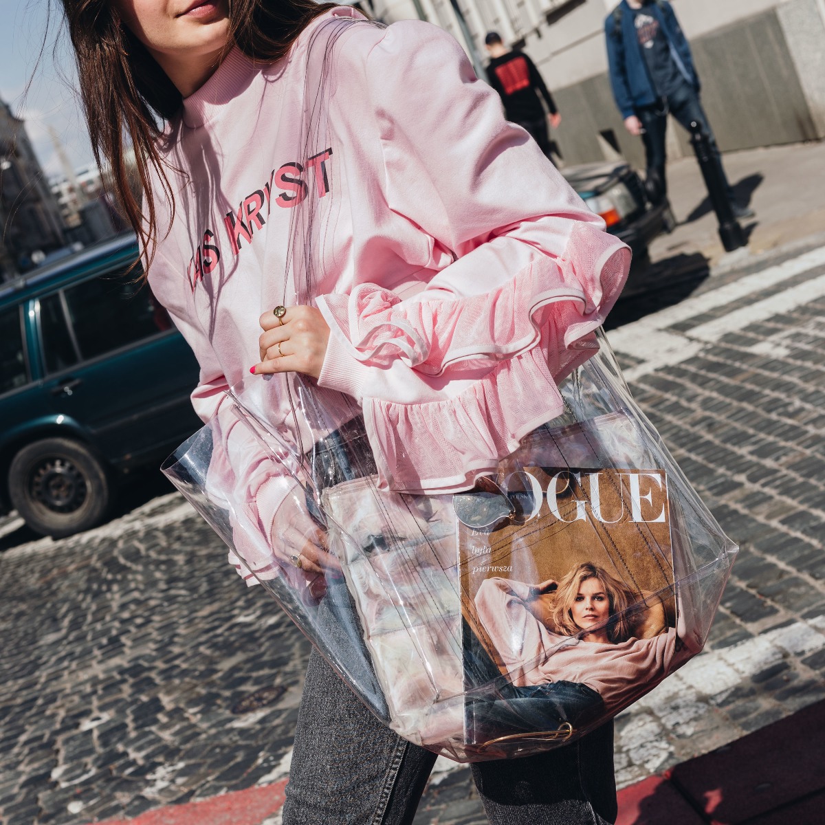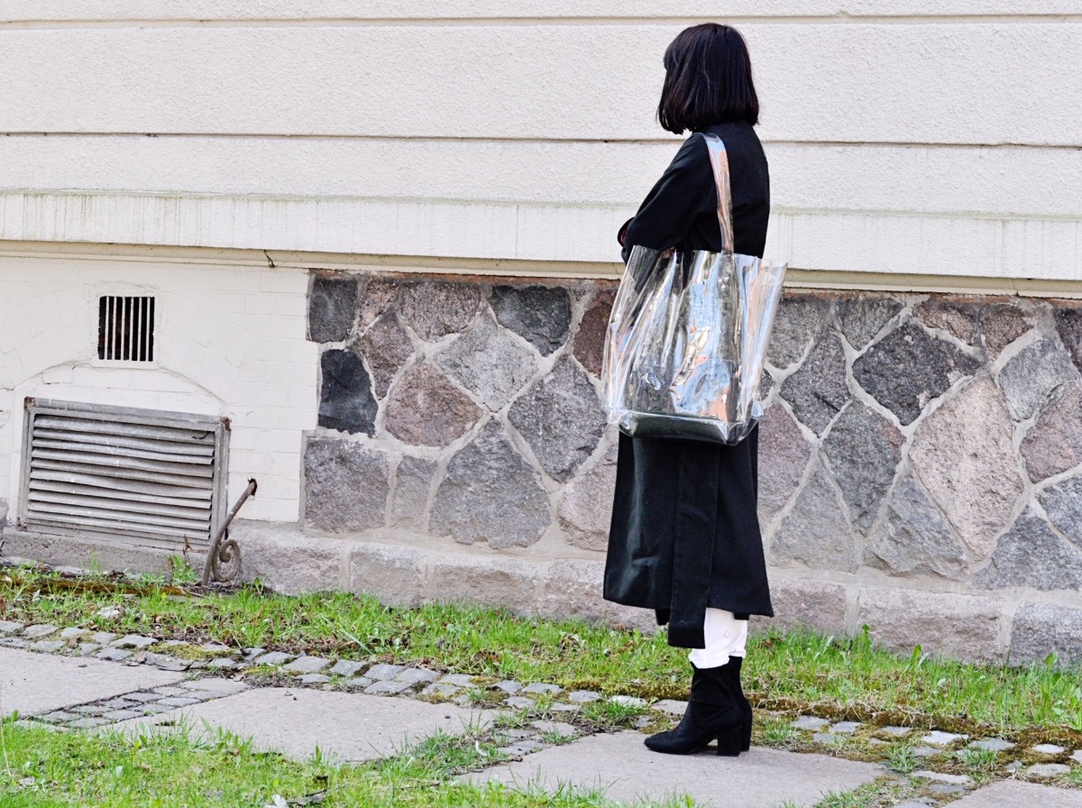 Transparentna torba na długich uszach. W środku jedna mała kieszonka. Dla kontrastu przeszyta czarną nicią.