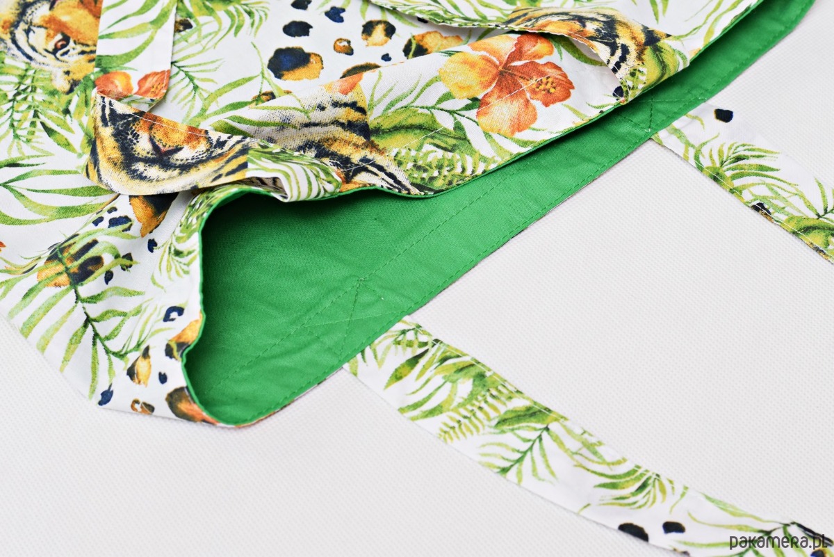 Ekologiczna torba na zakupy uszyta z bawełny 100% bawełnianą zieloną podszewką.