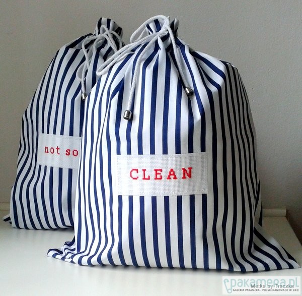 Zestaw klasycznych wakacyjnych torebek podróżnych na bieliznę w marynarskie paski. Napisy podpowiedzą, gdzie szukać czystych, a gdzie wrzucić noszone części garderoby. Podczas kontroli bagażu na lotnisku nie będzie ambarasu. Aplikacja haftowana ręcznie, mistrzowskie wykonanie. Tkanina 100 bawełna, sznurek też wym 33 x 43 cm