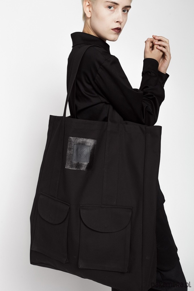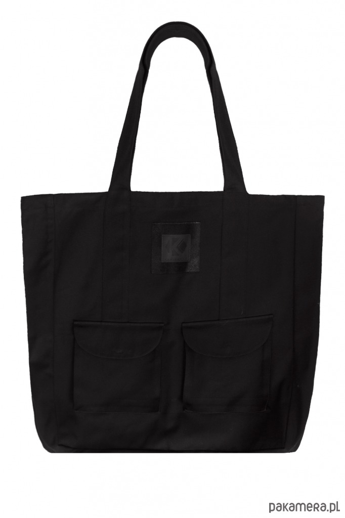 Torba z czarnej bawełny 100%. Na przodzie dwie duże kieszenie z klapkami zapinanymi na napy oraz metka KAS KRYST ze sztucznej skóry. W środku kieszeń na telefon i portfel.