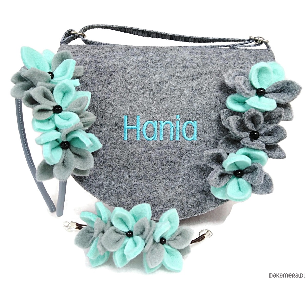 Torebeczka z imieniem plus opaska, bransoletka z malutkimi trzema kwiatuszkami,