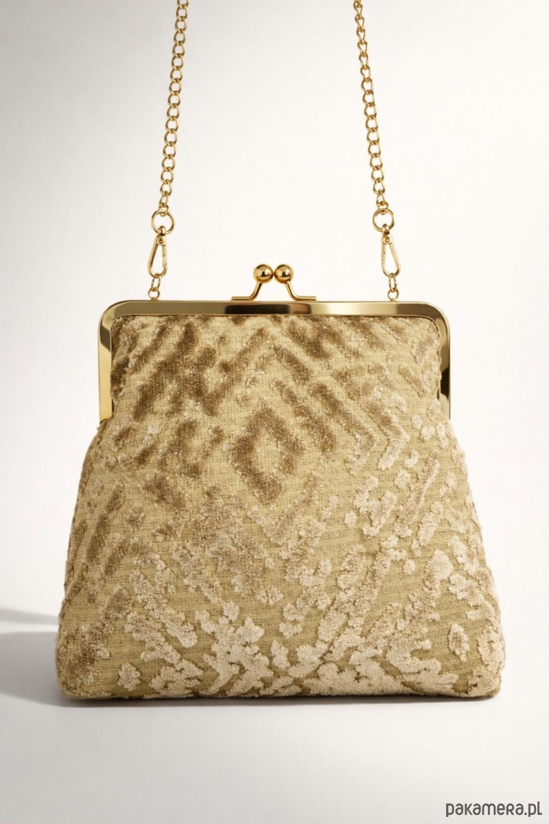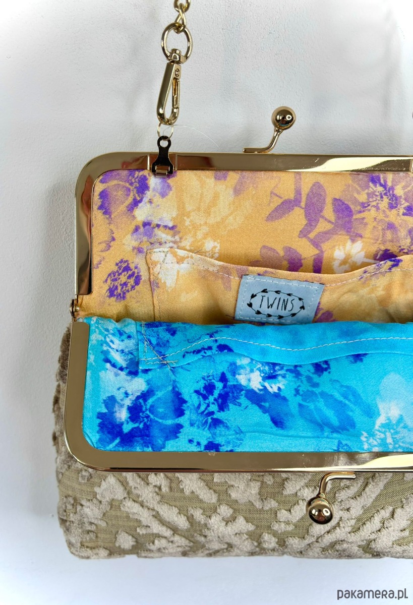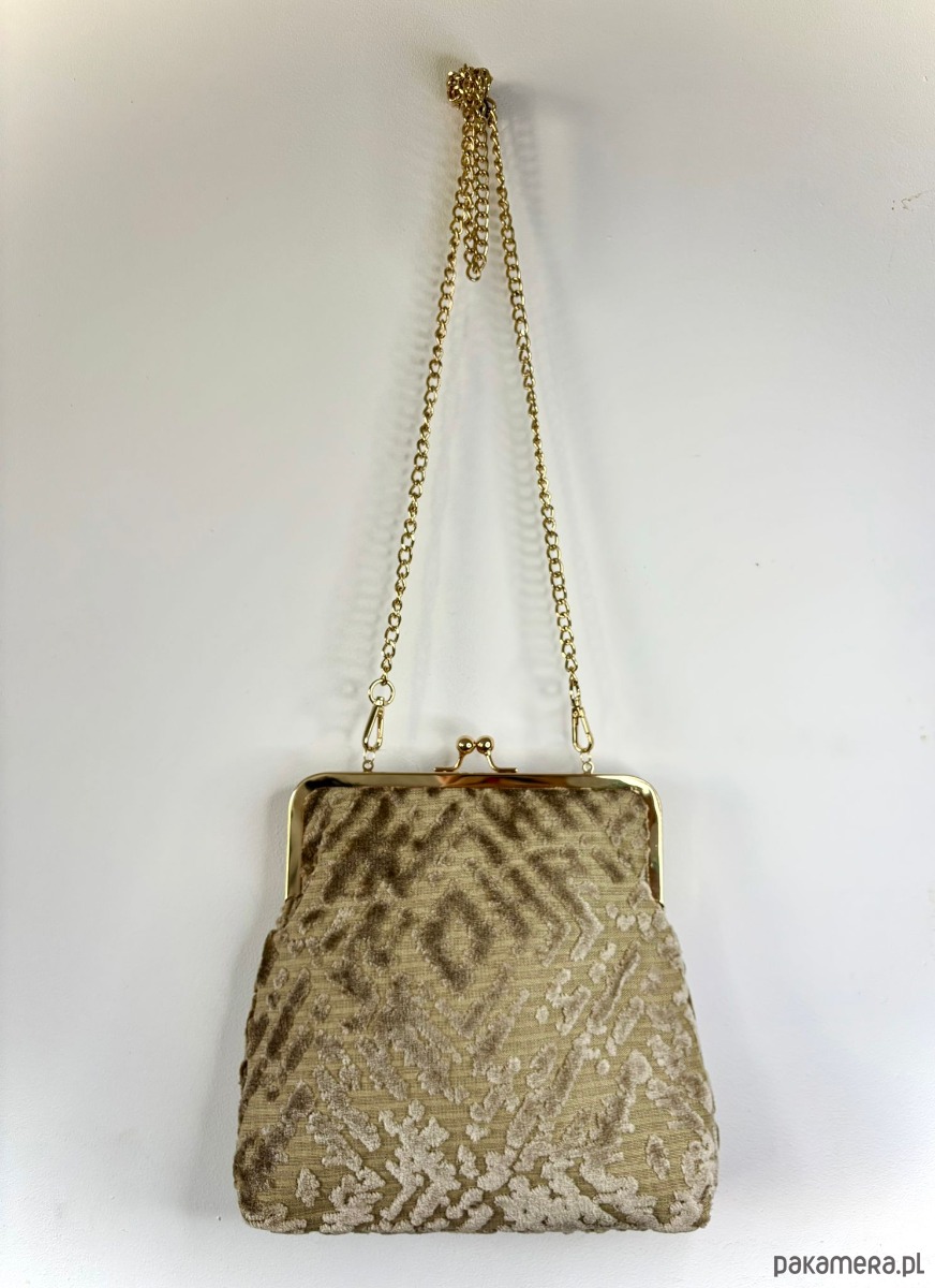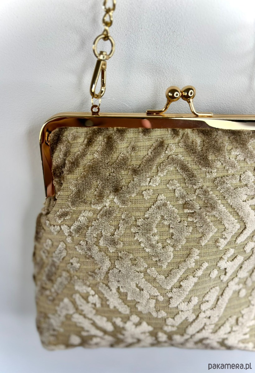 Mała, elegancka torebka zapinana na metalowe, zapięcie koloru złotego. Wykonana z beżowej tkaniny typu zamsz welwet. W środku podszewka, torebka jest wykonana z tkaniny obiciowej.