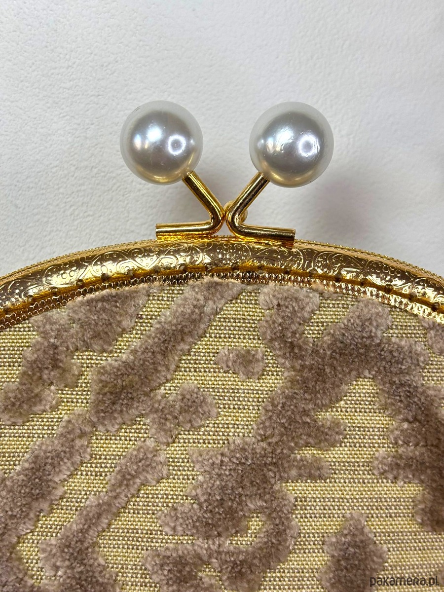 Elegancka torebka zapinana na metalowe, zapięcie koloru złotego. Wykonana z bezowej tkaniny . W środku podszewka, torebka jest wykonana z tkaniny obiciowej. Ramka (bigiel) jest przyszywana ręcznie do torebki .