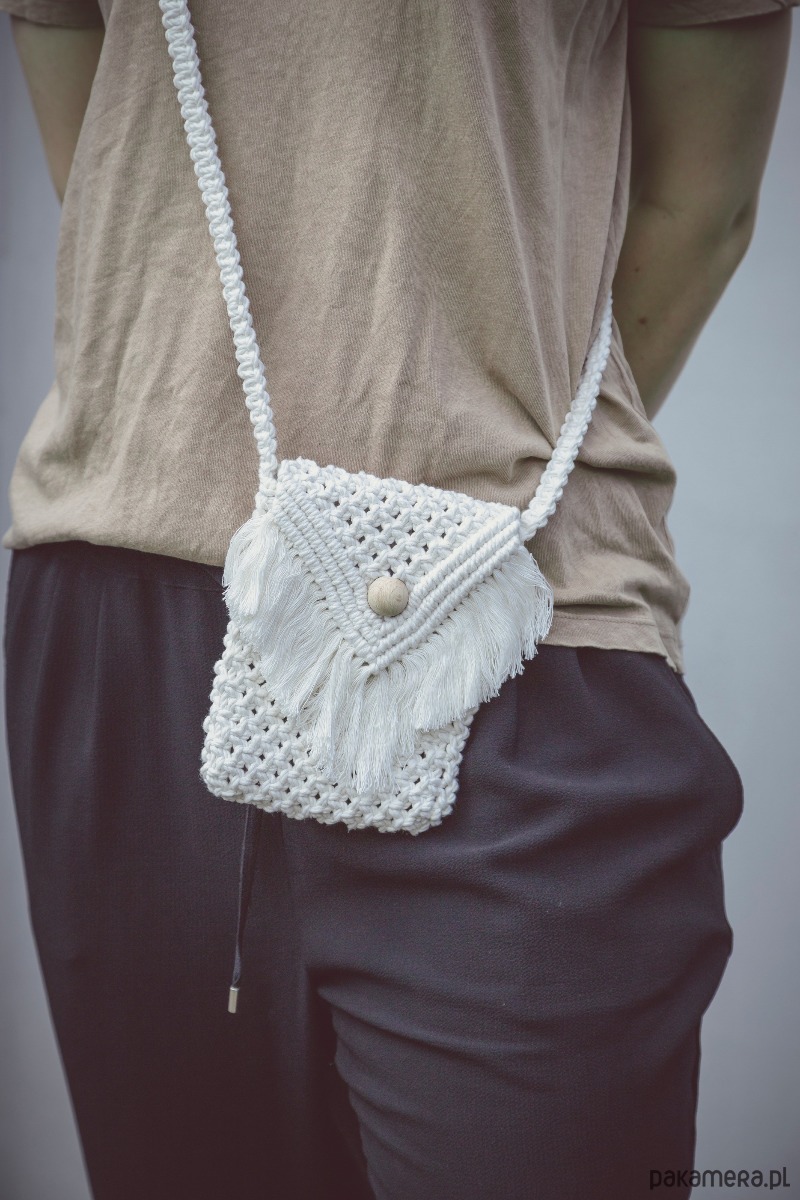 Torebka w kolorze złamanej bieli.. Sznurek bawełniany skręcany . Zapinana na magnes.. Ozdobny koralik.. Pasek nie jest regulowany.. Wymiary torebki : szerokość 13cm, wysokość 16.5cm.. Grubość 2.5cm..długość paska mierzona na płasko od góry torebki 61cm ( razy 2 to calkowita długość paska.. Ja tu podaje tak jak by byla założona i jedna strona.. Piękna do letnich stylizacji.. Na telefon.