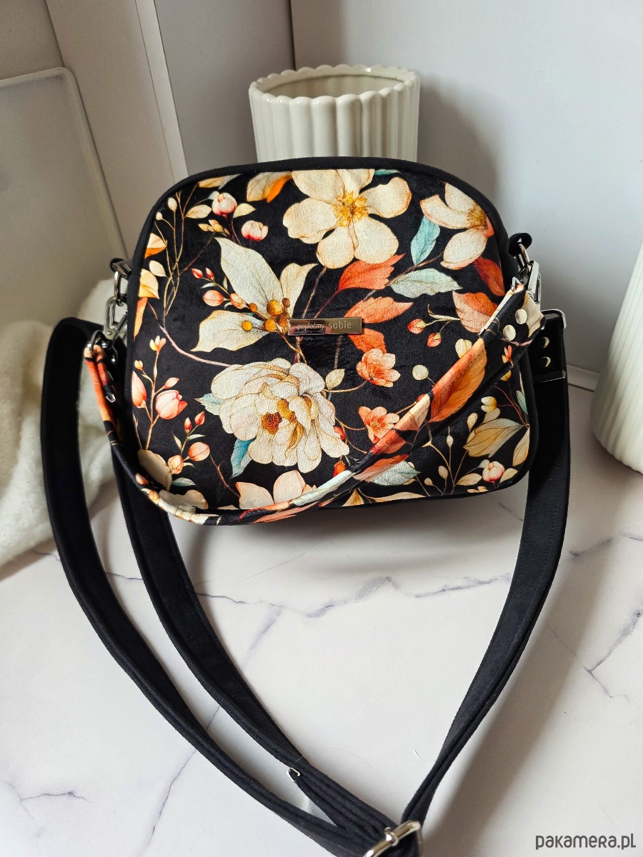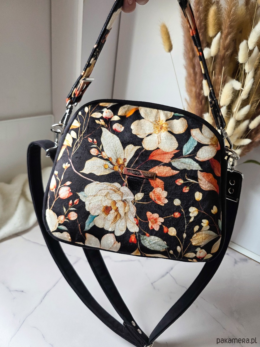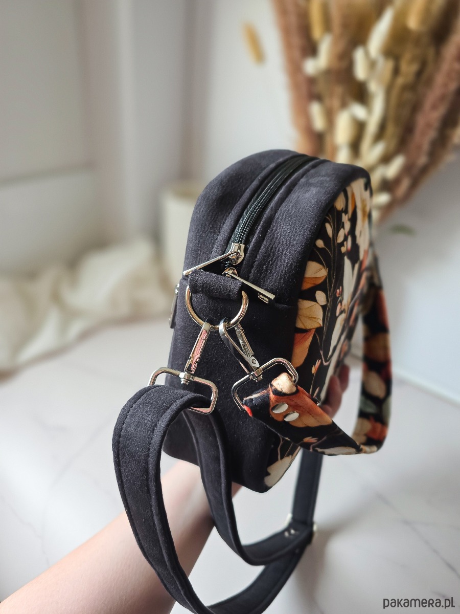 Torebka została uszyta z czarnej tkaniny nubukowej i tkaniny tapicerskiej (przód).