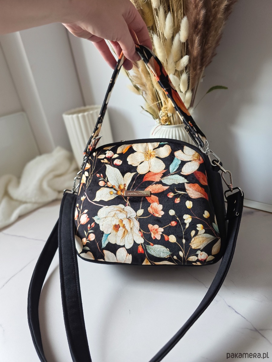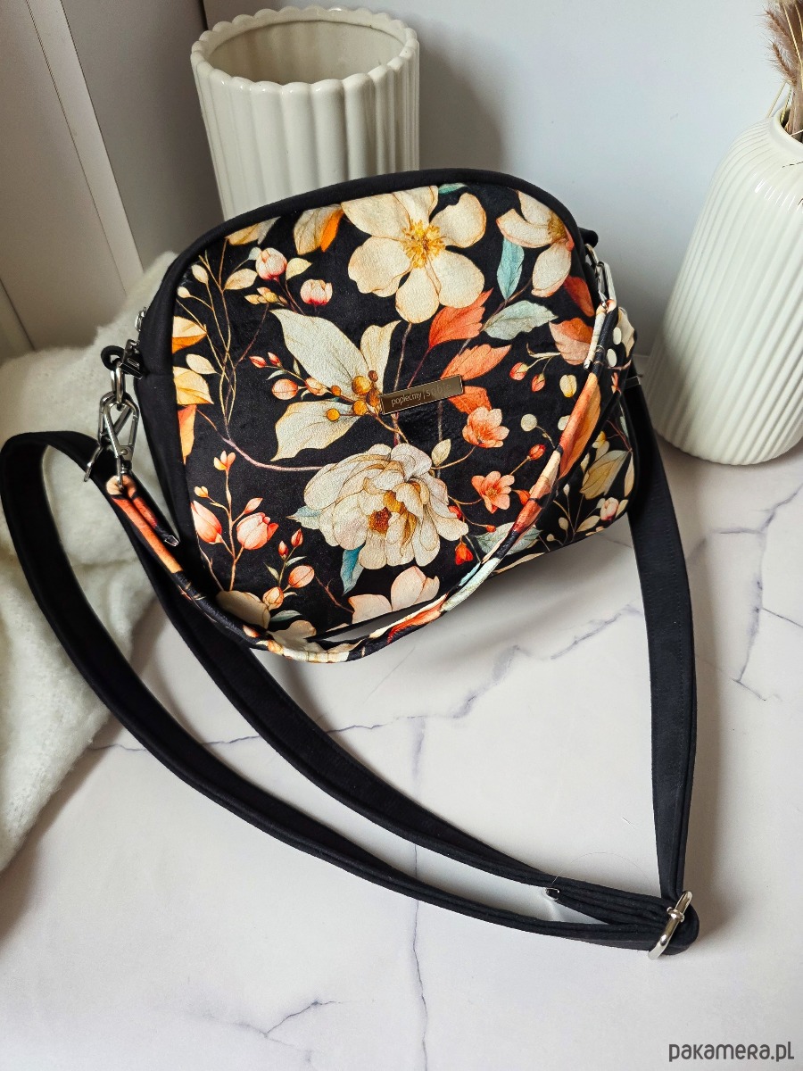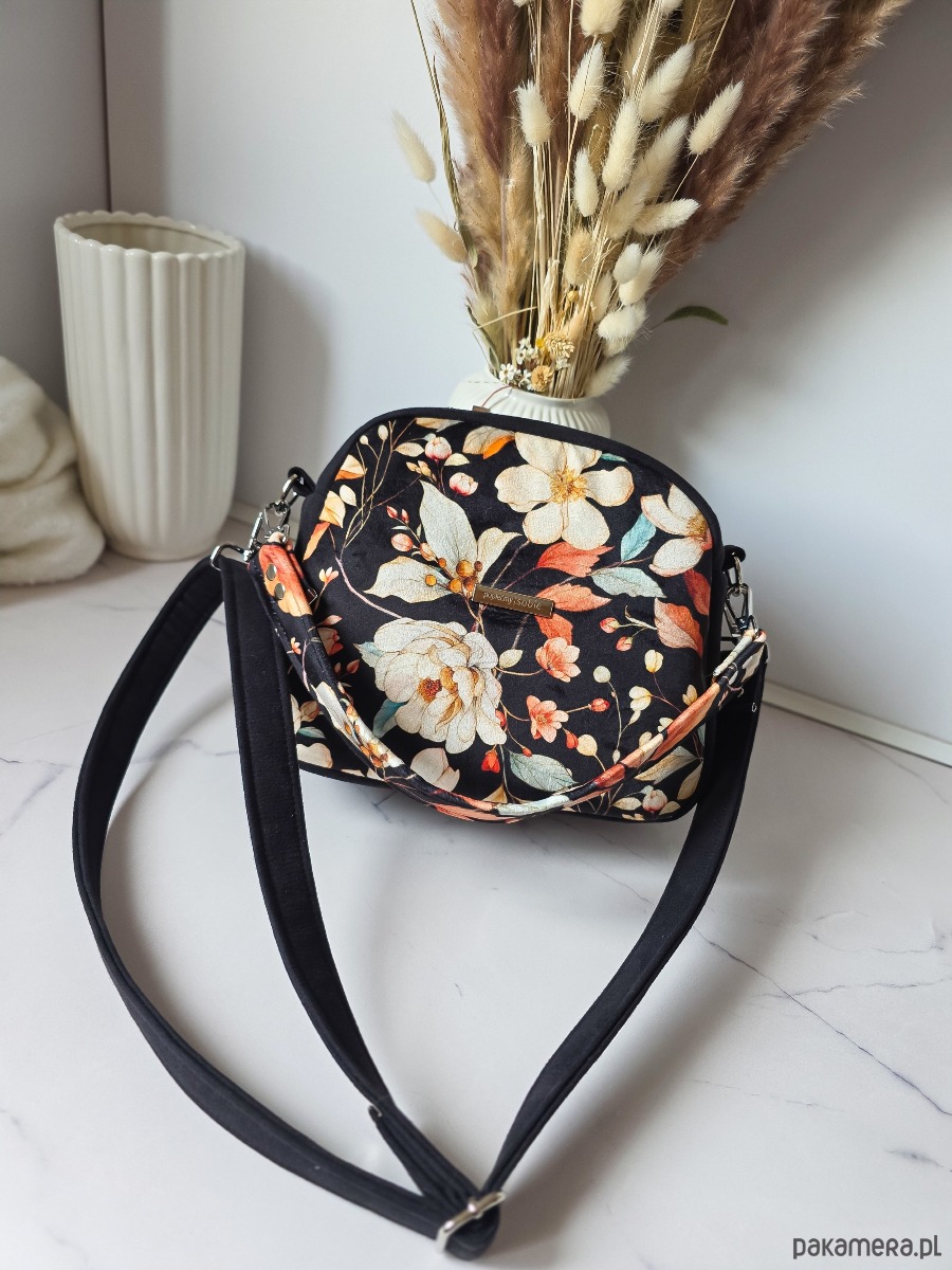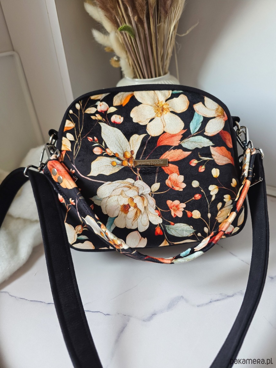 Torebka została uszyta z czarnej tkaniny nubukowej i tkaniny tapicerskiej (przód).