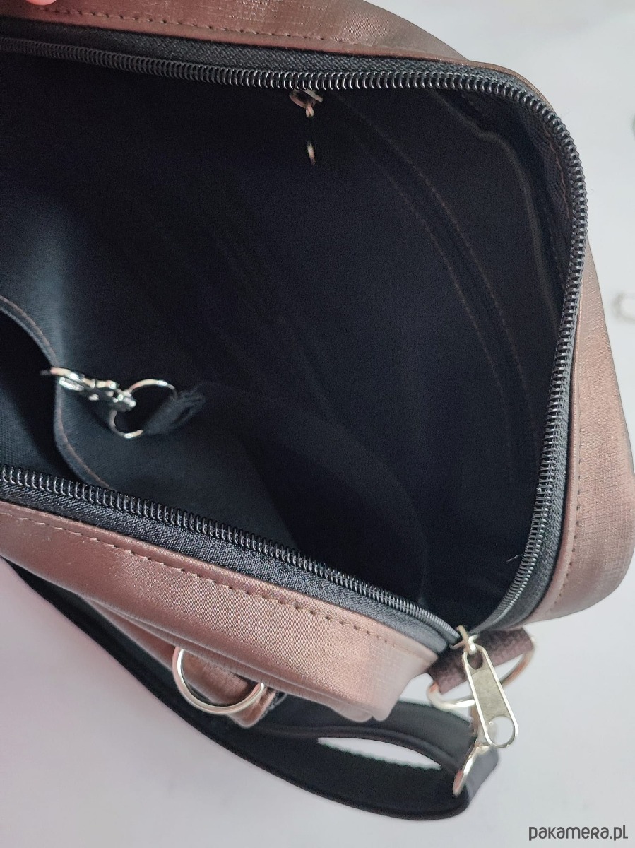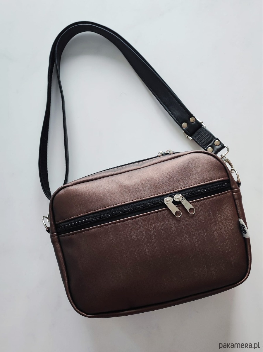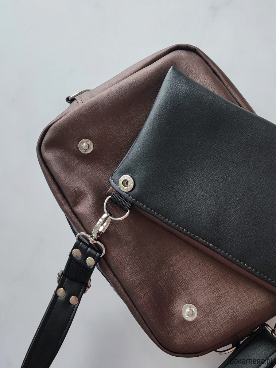 Materiał: eko skóra brązowa metaliczna i czarna gładka, wodoodporna podszewka.