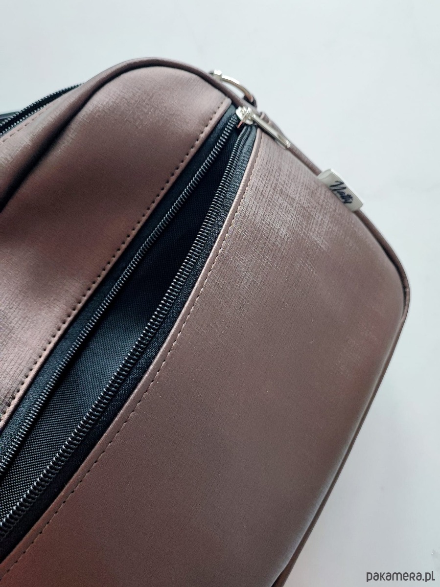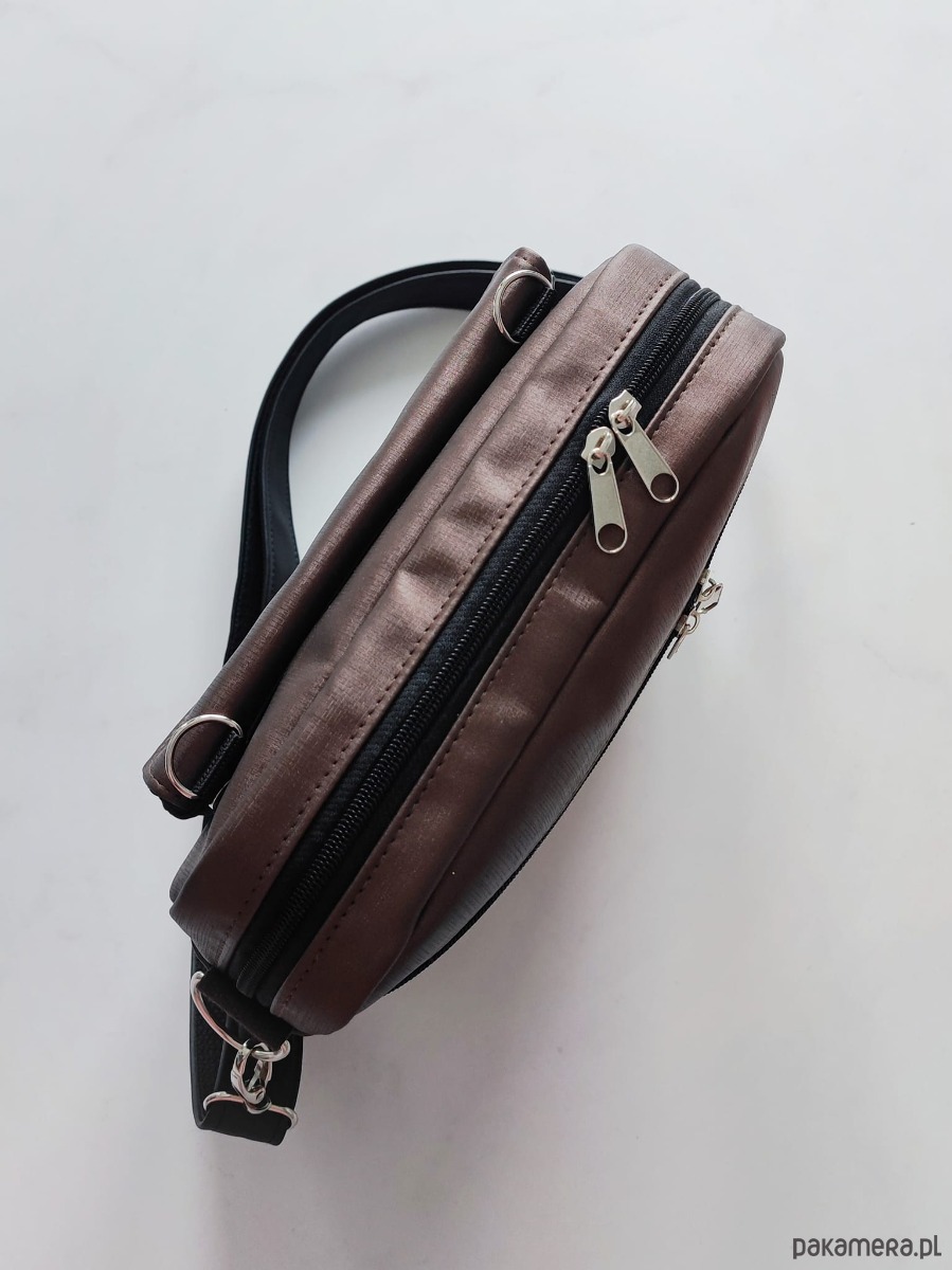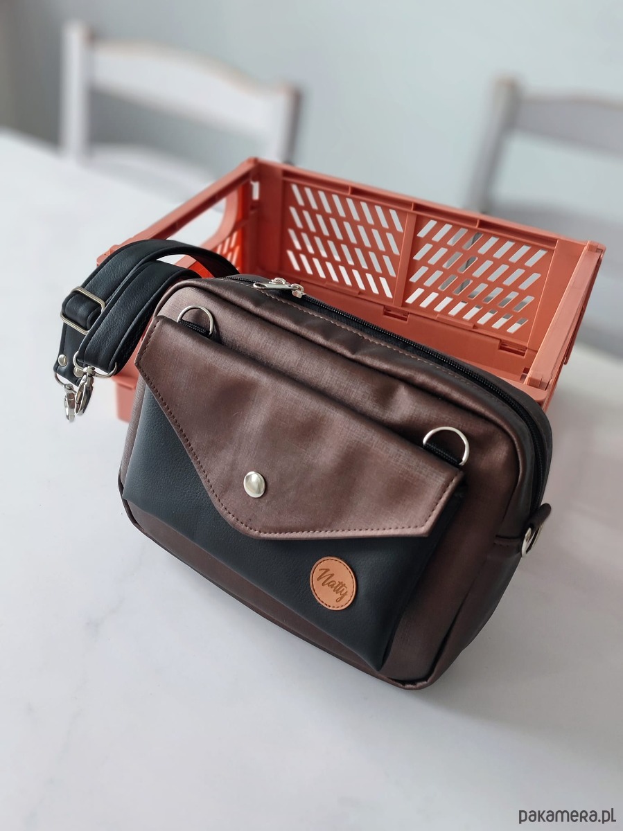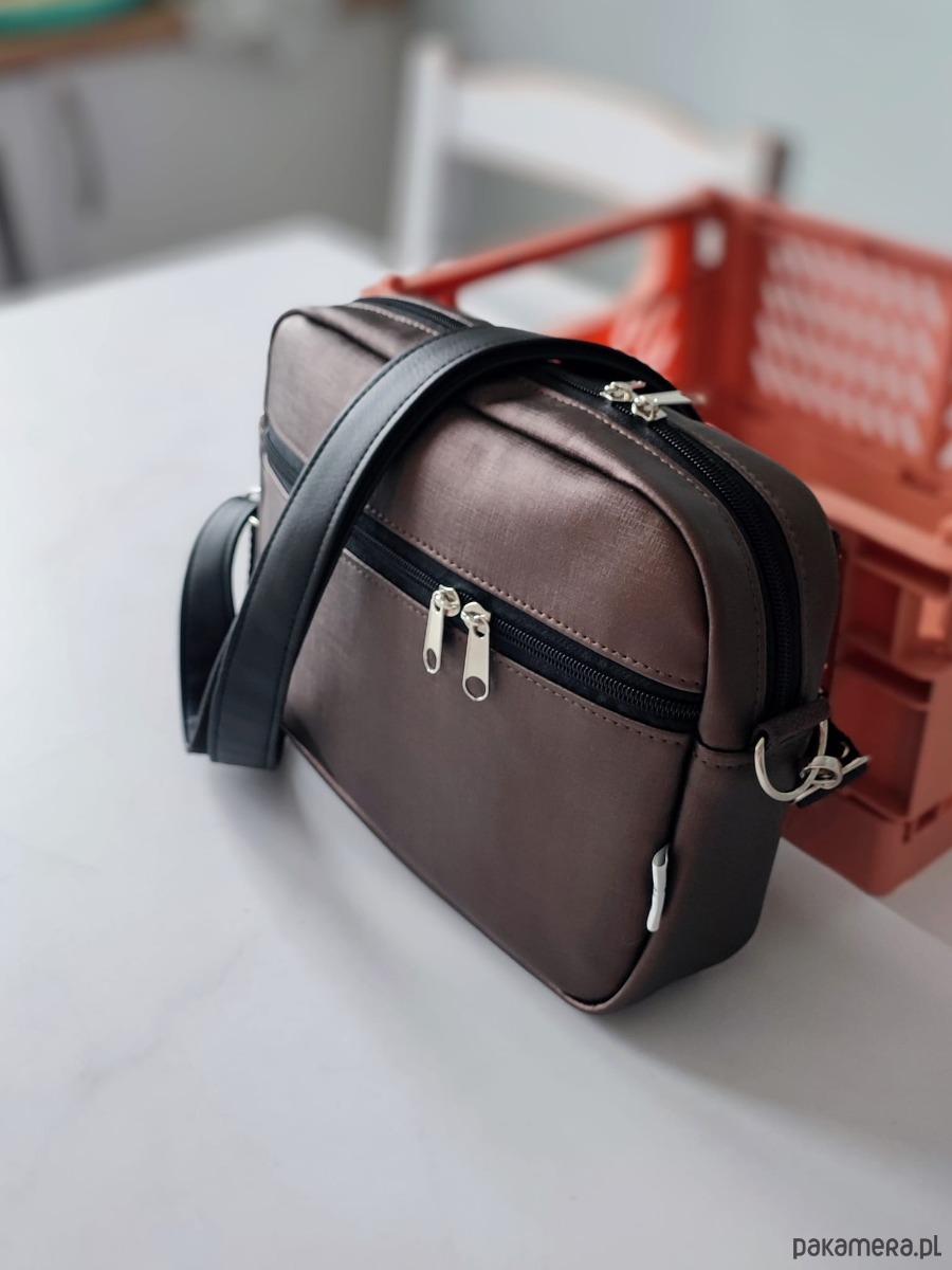 Materiał: eko skóra brązowa metaliczna i czarna gładka, wodoodporna podszewka.