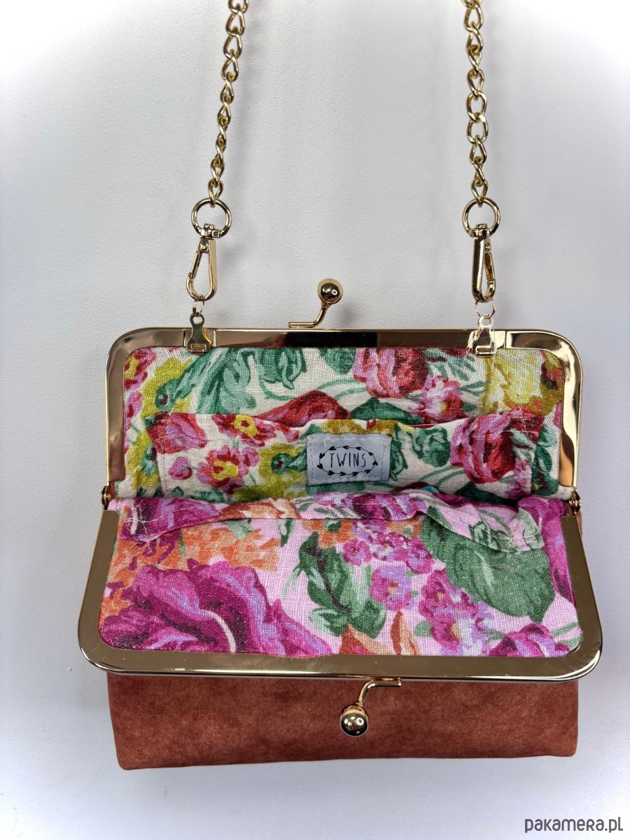 Mała, elegancka torebka zapinana na metalowe, zapięcie koloru złotego. Wykonana z brązowej tkaniny. kolor wpada w rudy. W środku podszewka, torebka jest wykonana z tkaniny obiciowej.