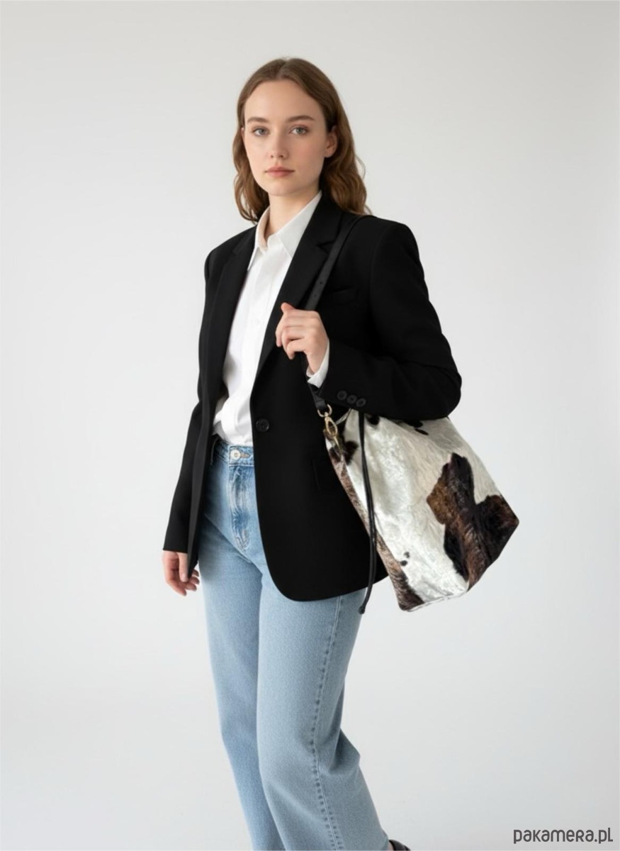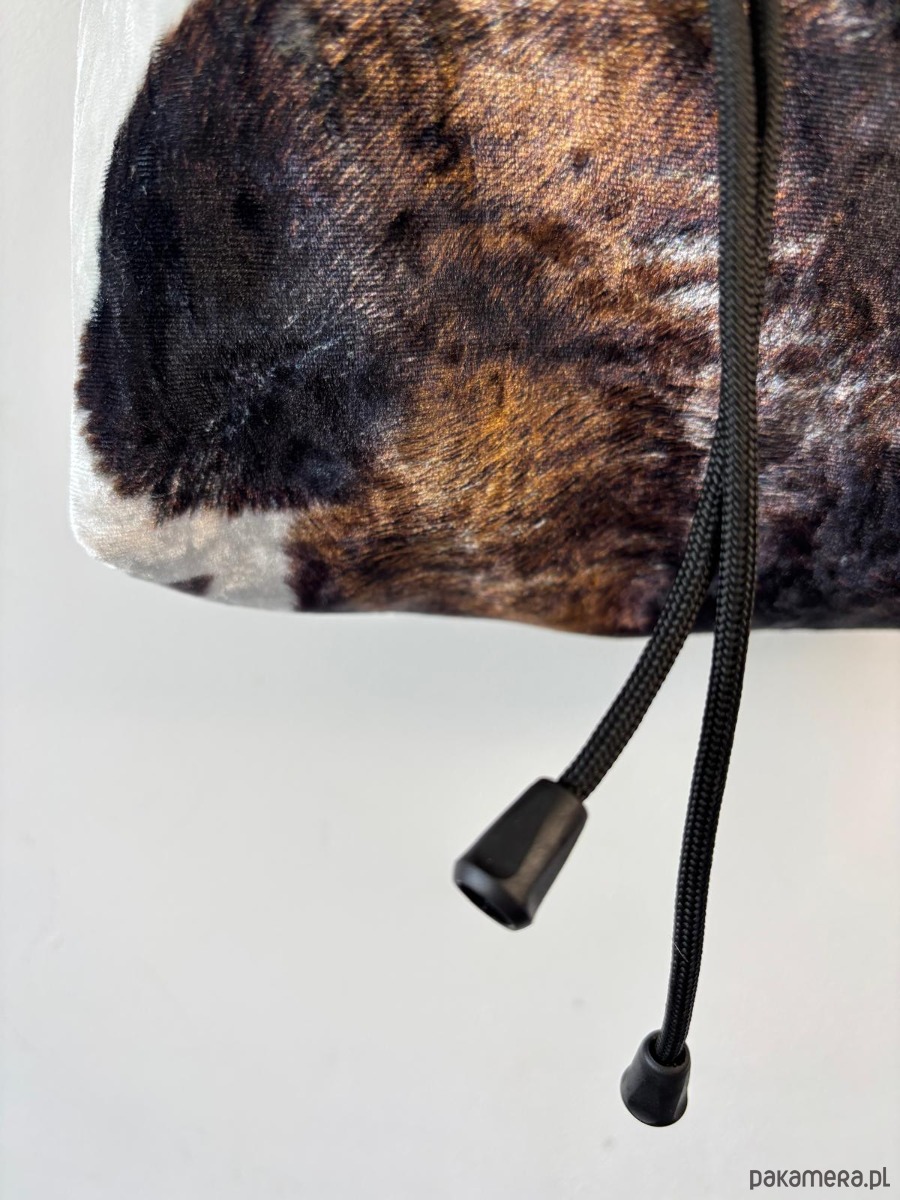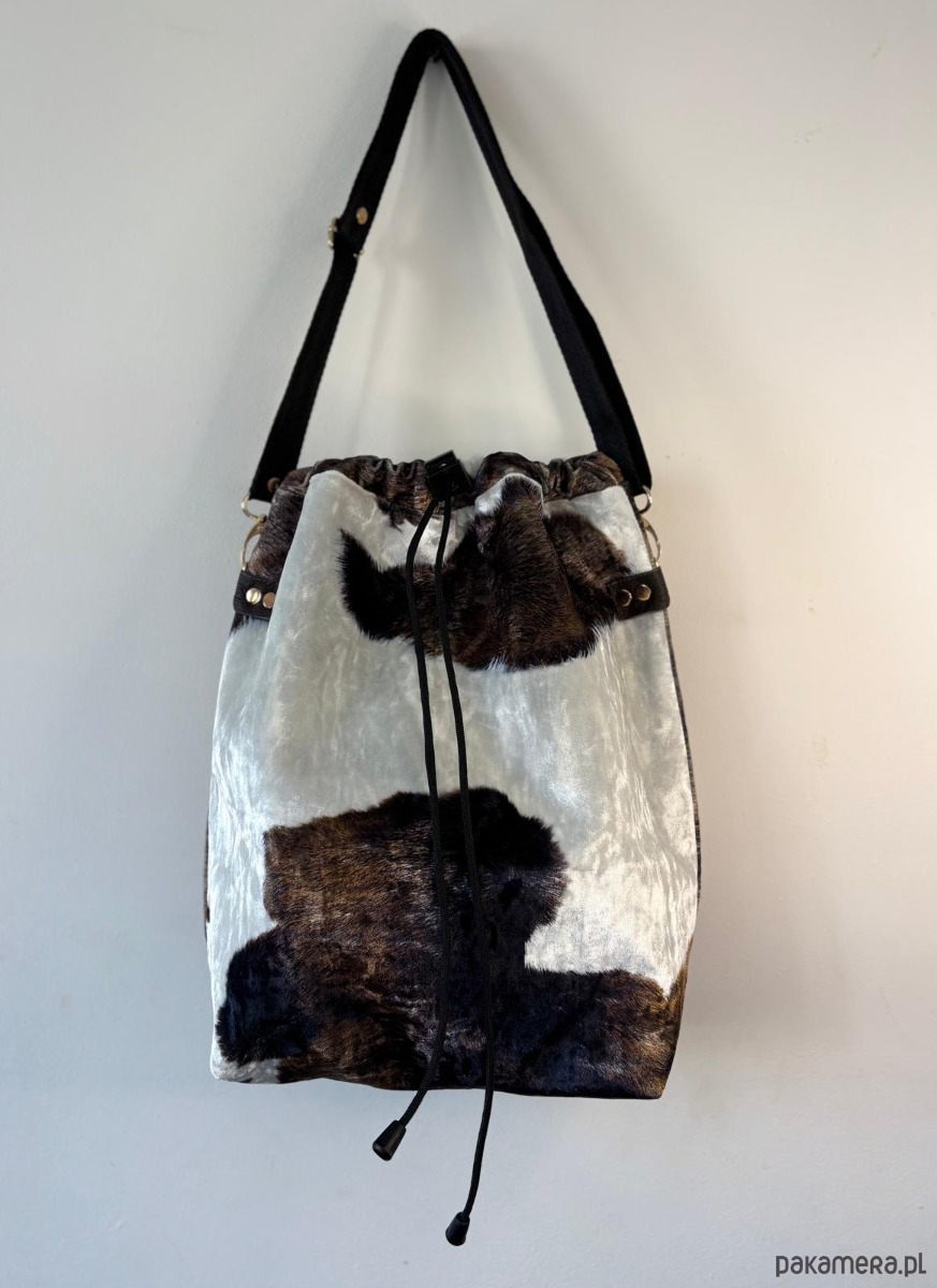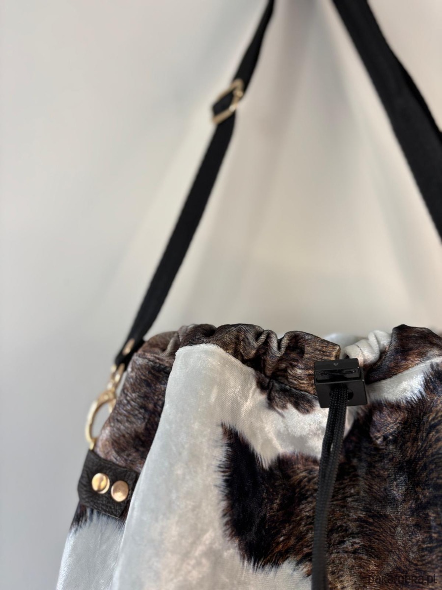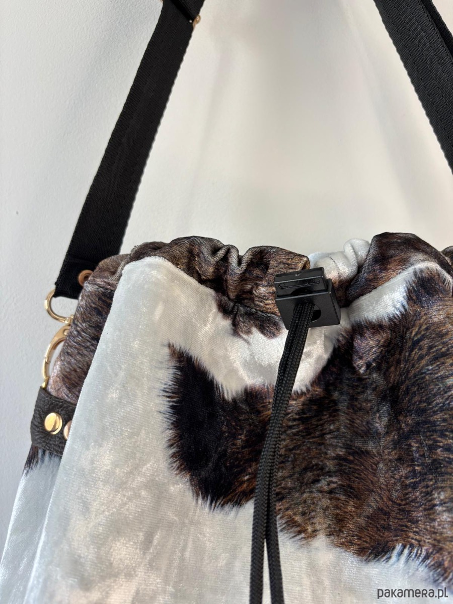 Duża sportowa, torebka zaciągana na czarny sznurek. Wykonana z czarno-brązowo-białej, tkaniny. Z printem zwierzęcym. W środku podszewka , torebka jest wykonana z tkaniny obiciowej. Rączka to regulowany pasek do zakładania przez głowę. Torebka jest usztywniana . Wymiary: 30(długość)x30(szerokość)x10(bok); w komplecie regulowana raczka parciana.
