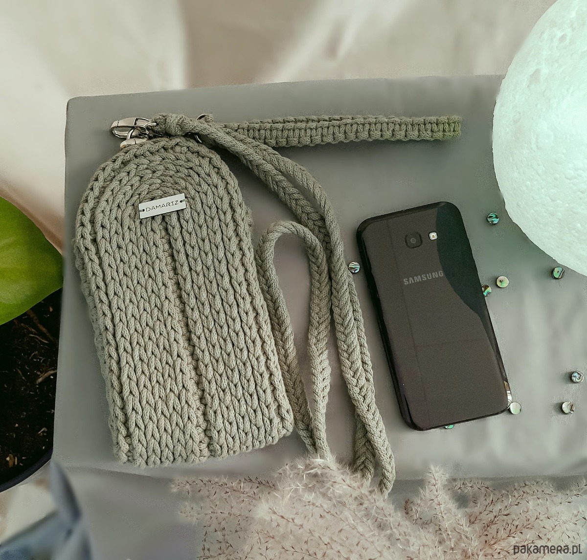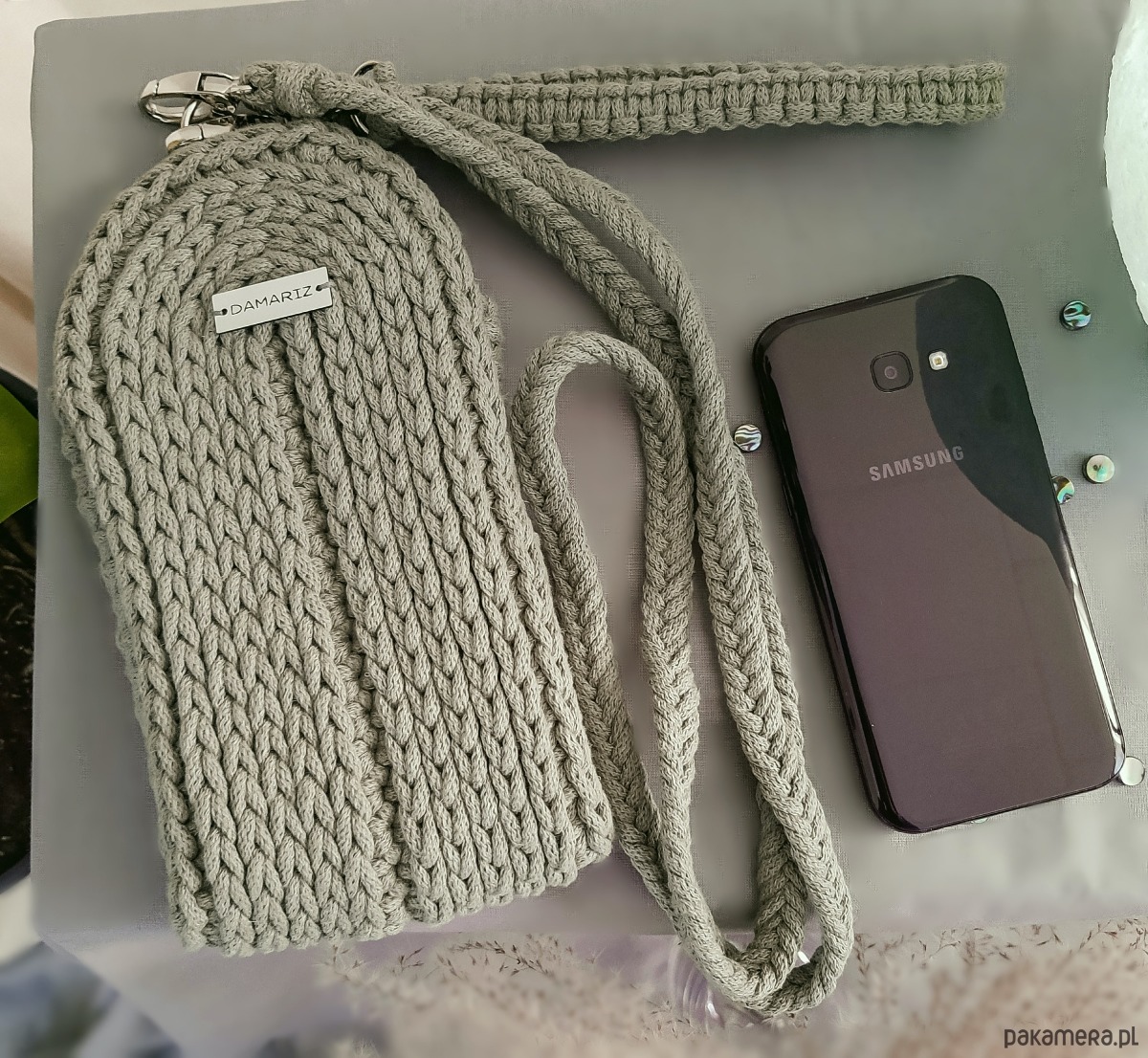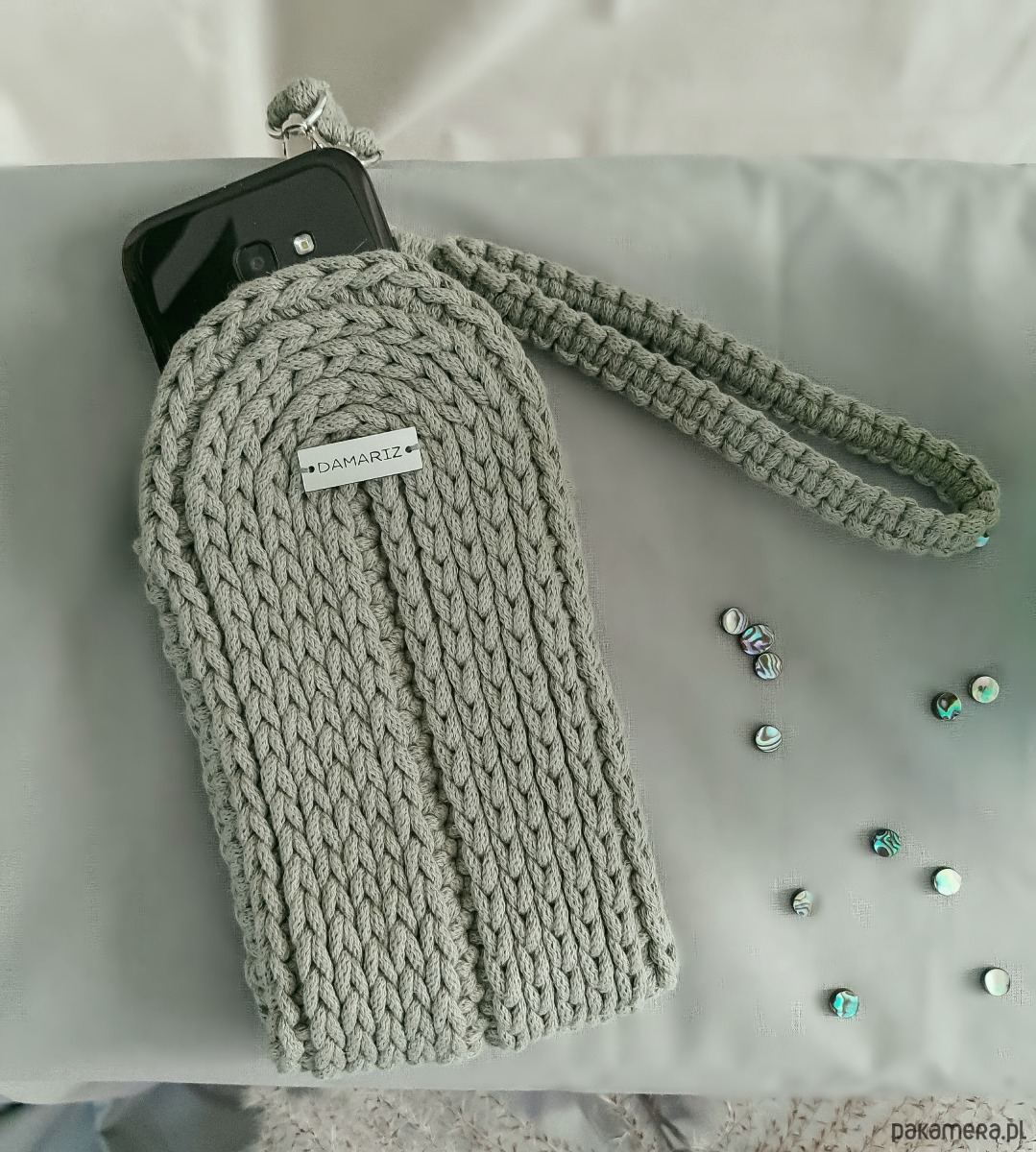 Wykonałam ją ręcznie ze sznurka 100 % bawełnianego z rdzeniem. Dzięki temu świetnie zachowuje swój kształt a także nie elektryzuje się. Może być prana w pralce w temp. 30 stopni.
