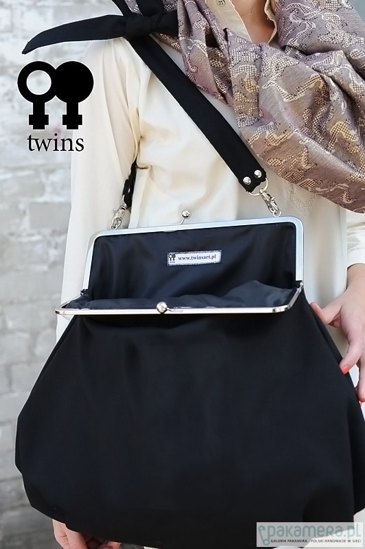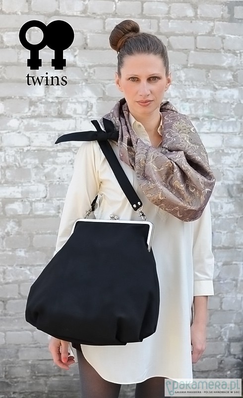 Elegancka, duża, marszczona torebka zapinana na modne metalowe zapięcie bez problemu mieści format A4 Wykonana z czarnej, tkaniny . W środku podszewka (proszę zapytać o kolor w aktualnej kolekcji) i kieszonka. Torebka jest usztywniana i zaopatrzona w regulowaną rączkę do noszenia przez ramię. Wszystkie torebki tworzone są w naszej pracowni i zaopatrzone w metki z logo Twins. Wymiary: zapięcie 29cm, długość 50cm, szerokość w najszerszym miejscu 50cm, dł. raczki do regulacji.
