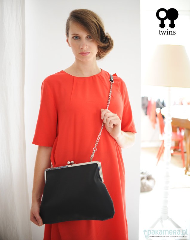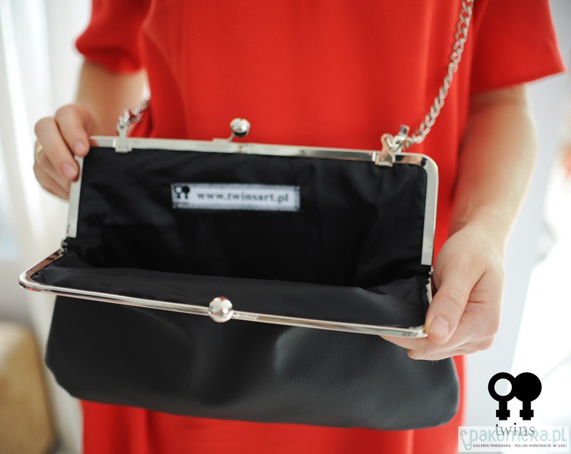 Oryginalna torebka wykonana z eko skóry w kolorze czarnym. W środku czarna podszewka oraz kieszonka. Torebka posiada odpinany na karabińczyki ozdobny łańcuszek więc może również służyć jako elegancka kopertówka do ręki. Łańcuszek jest przedzielony paskiem. Zapinana jest na modne metalowe zapięcie o szerokości 25cm. Wymiary: 37(szerokość)x24(wysokość)x7cm(bok); Dł. łańcuszka 110cm