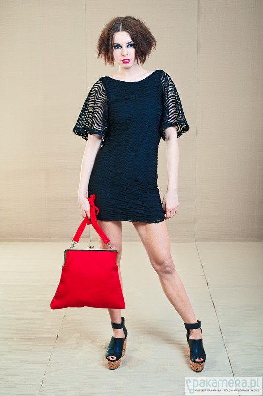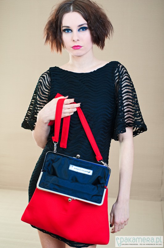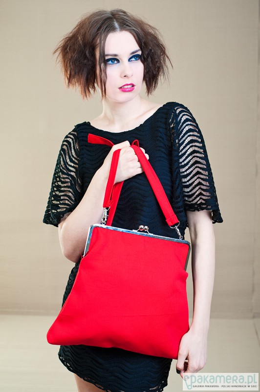 Elegancka torebka ,zapinana na duże, modne, metalowe zapięcie - mieści format A4 Wykonana z czerwonej, tkaniny . W środku podszewka i kieszonka. Podszewka może mieć inny kolor niż prezentowana na zdjęciu.Torebka jest usztywniana i zaopatrzona w regulowaną rączkę do noszenia przez ramię. Wszystkie torebki tworzone są w pojedynczych egzemplarzach i zaopatrzone w metki z logo Twins. Wymiary: zapięcie 28cm, długość 33cm, szerokość w najszerszym miejscu 38cm, dł. raczki do regulacji.