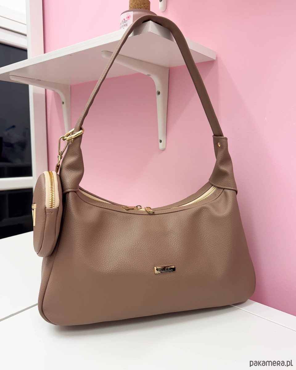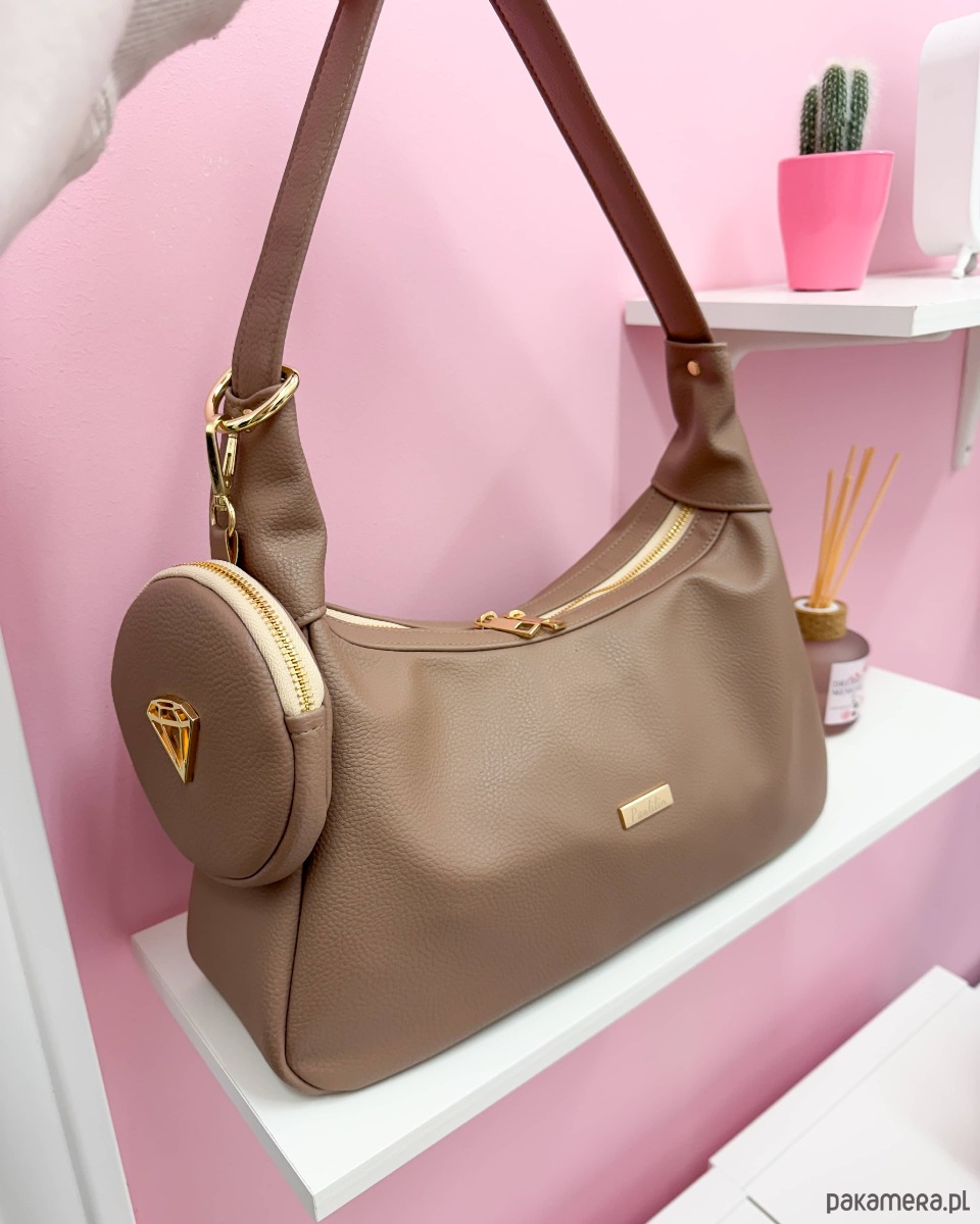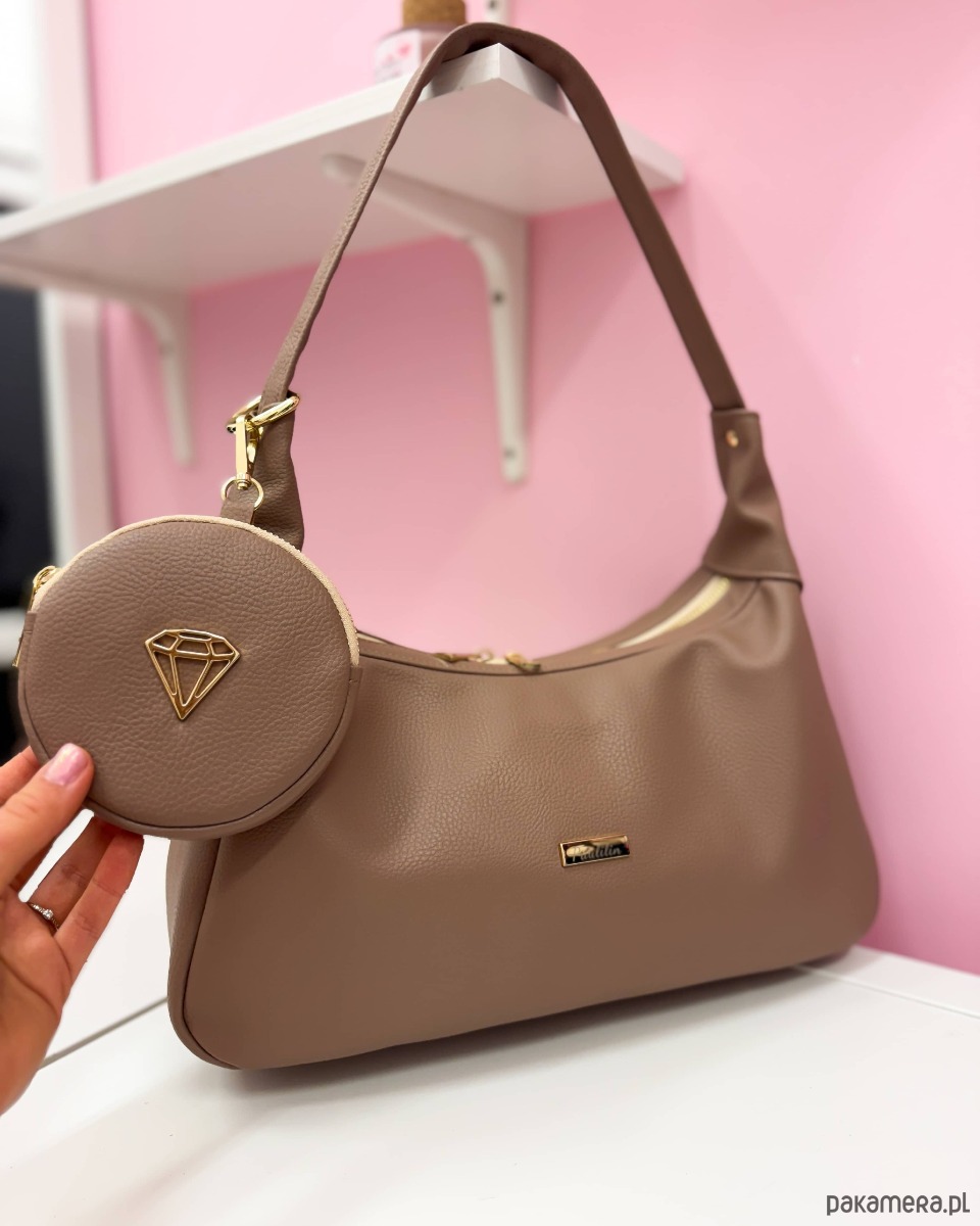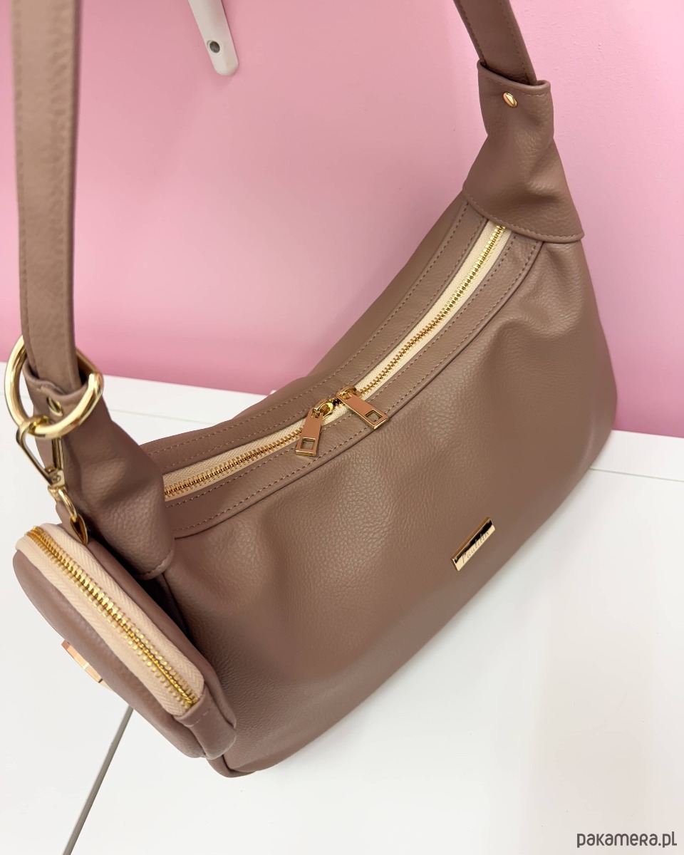 Torebka wykonana ze skóry ekologicznej przemiłej w dotyku kolorze taupe.