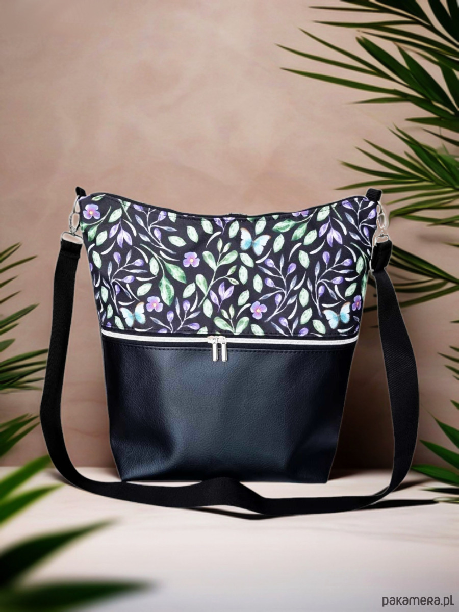 Tył oraz dół torebki wykonane są z ekoskóry w klasycznym czarnym kolorze, natomiast przód zdobi tkanina tapicerska wodoodporna, na której widnieją kolorowe, zielone i fioletowe liście oraz subtelne motylki.