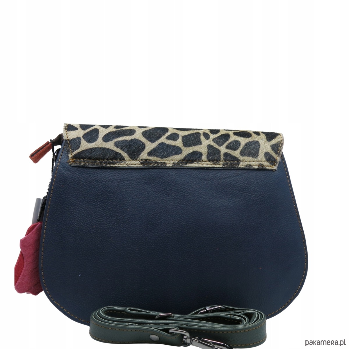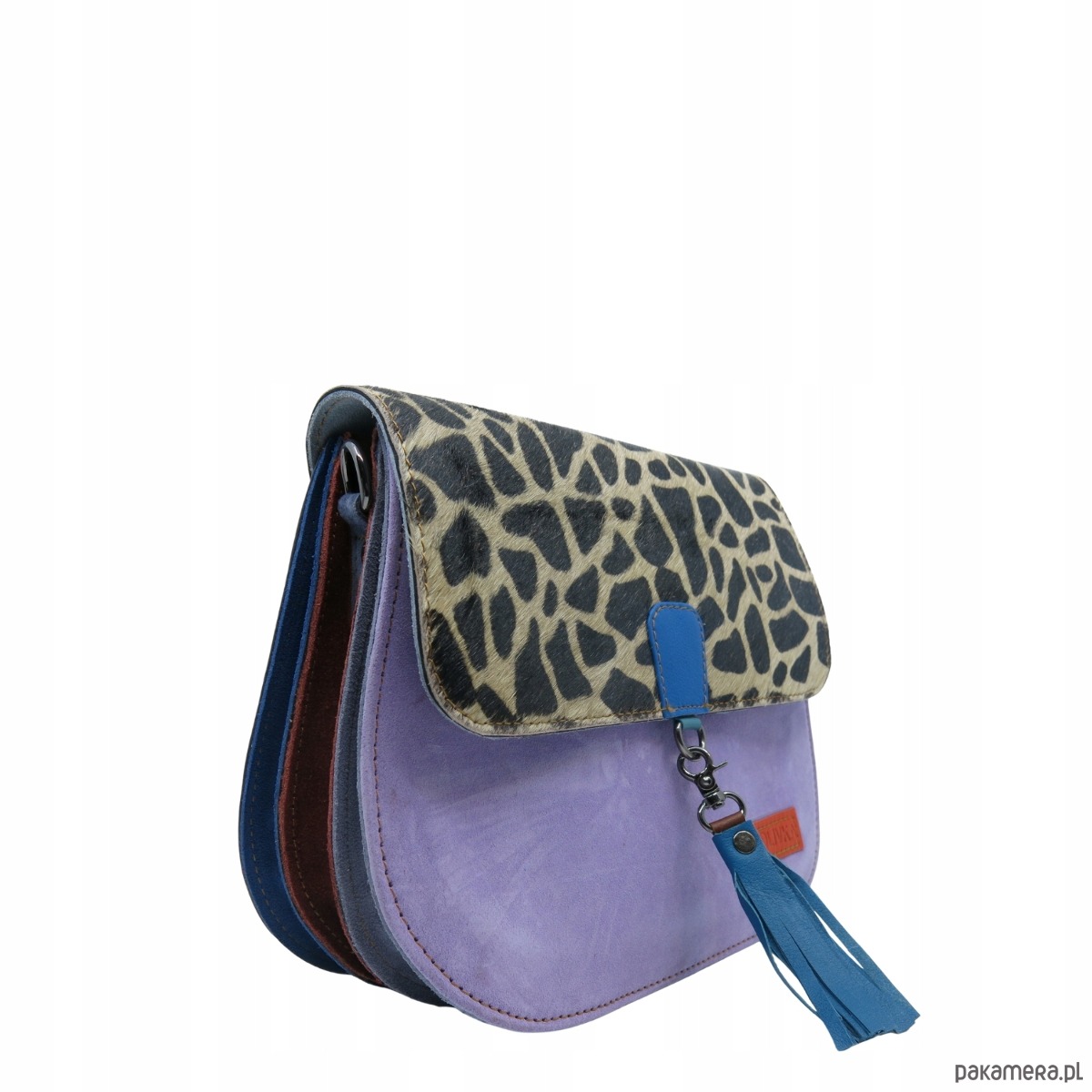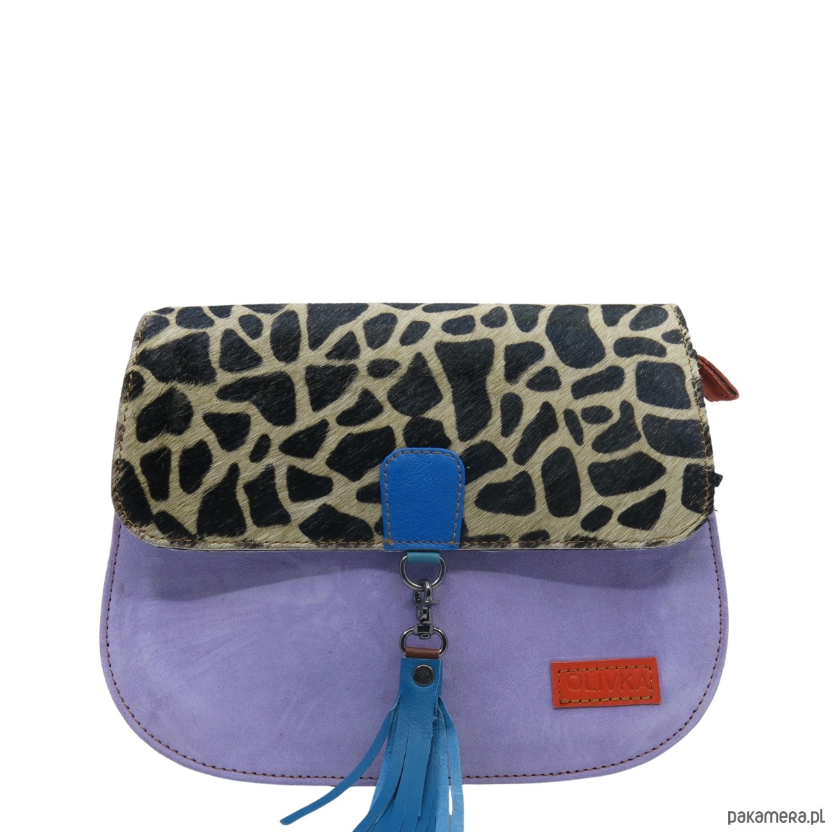 skórzana klapka z naturalnym włosiem ozdobiona nadrukiem