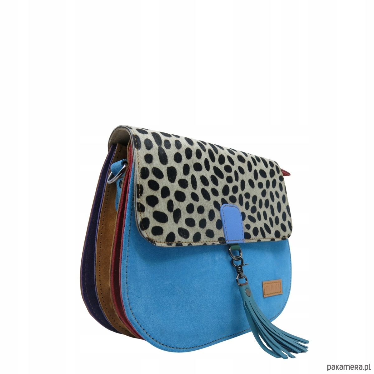 skórzana klapka z naturalnym włosiem ozdobiona nadrukiem