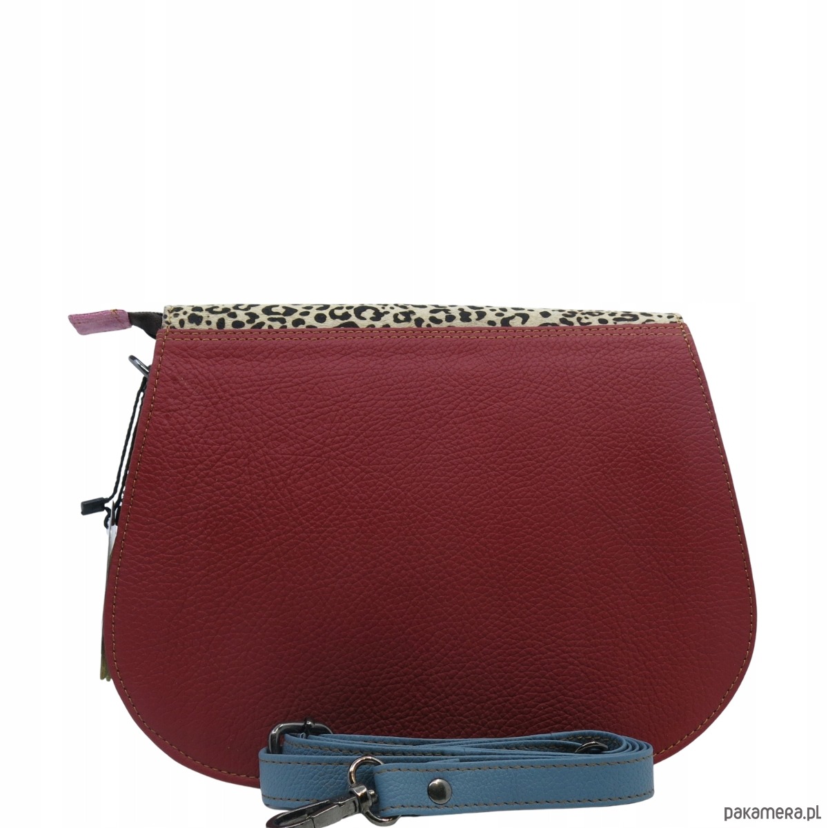 skórzana klapka z naturalnym włosiem ozdobiona nadrukiem