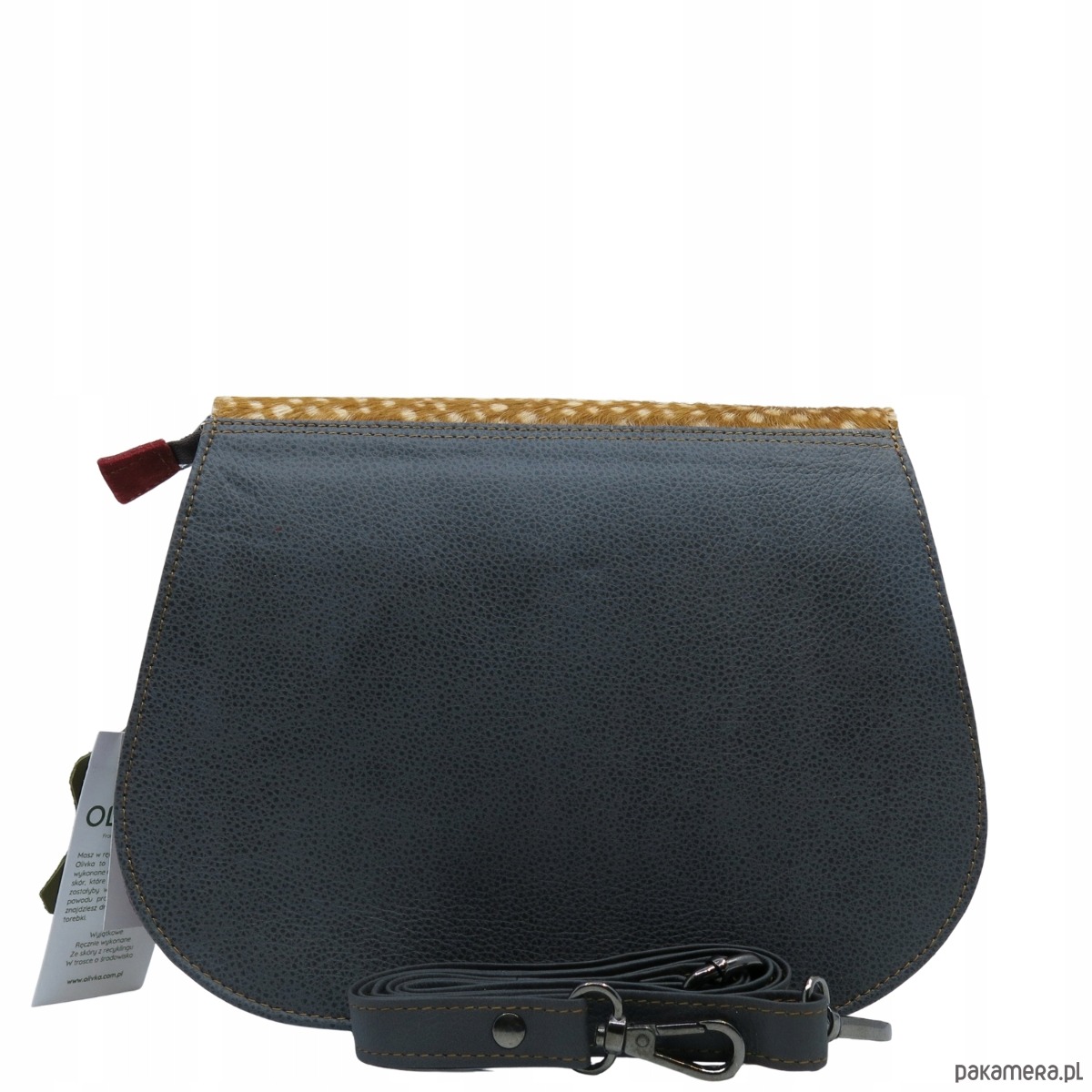 skórzana klapka z naturalnym włosiem ozdobiona nadrukiem