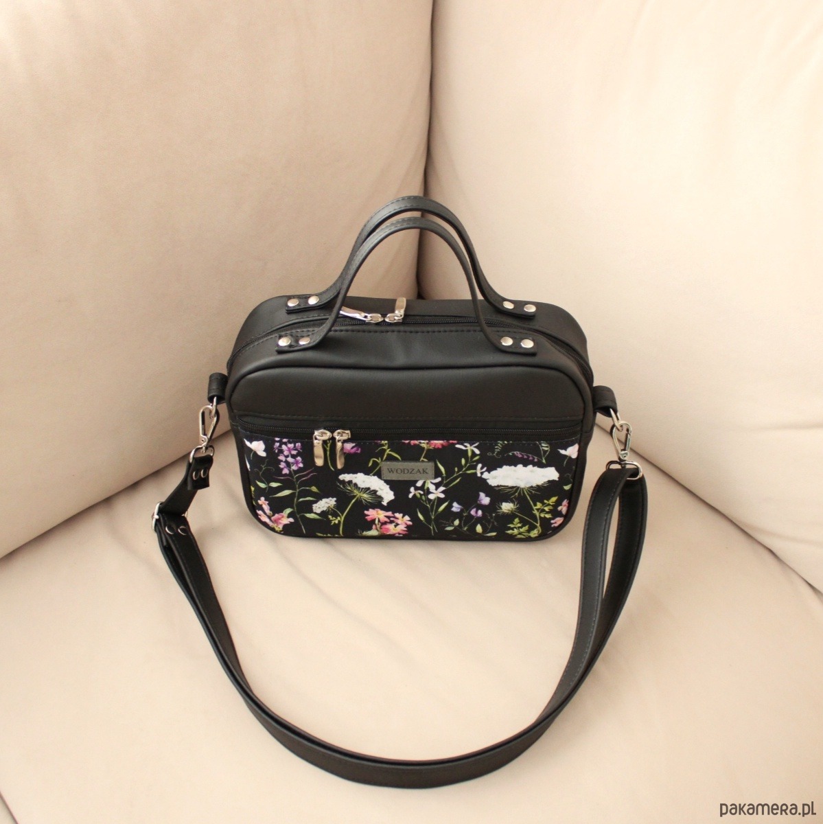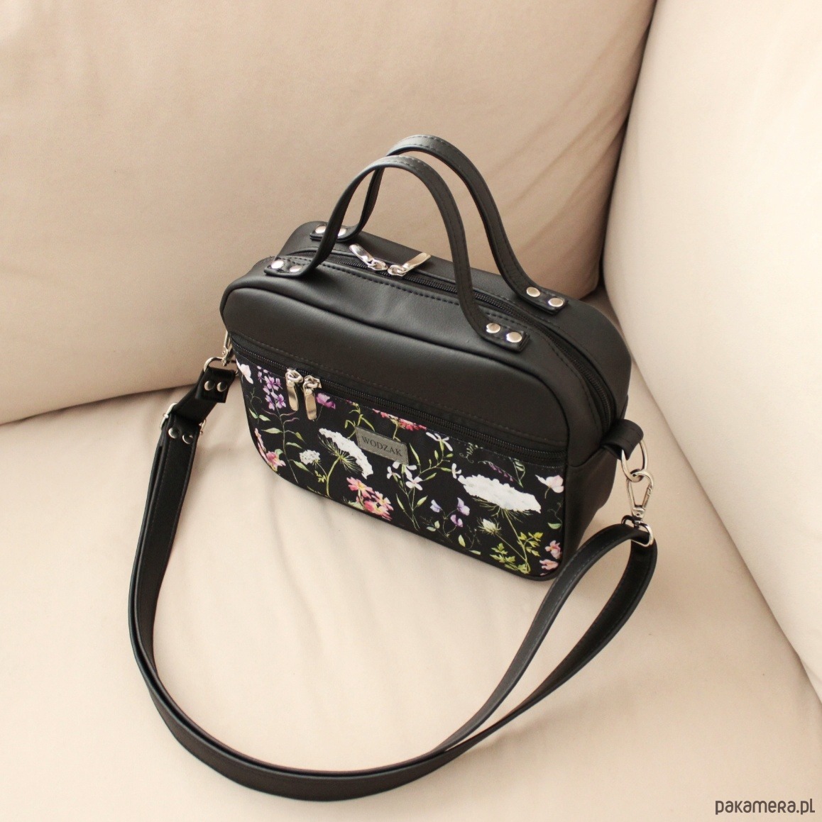 Torebka damska listonoszka z czarnej ekoskóry i tkaniny w kwiaty
