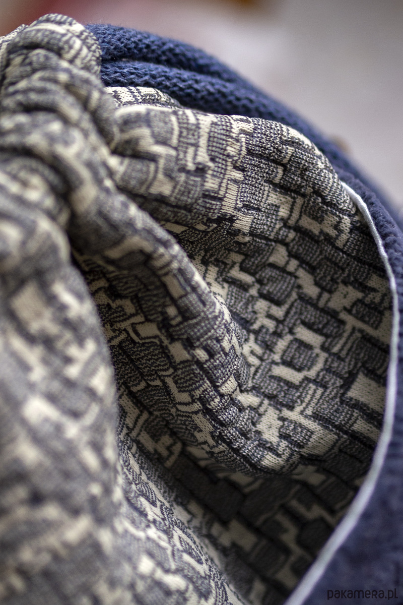 Całość ściągana grubym, bawełnianym sznurkiem w kolorze granatowym.