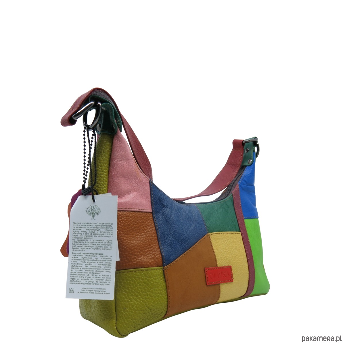 Ta unikalna torebka została uszyta ze starannie dobranych skrawków skóry naturalnej, którym nadaliśmy drugie życie. To, co dla innych mogło być bezużyteczne, u nas staje się pięknym i funkcjonalnym dodatkiem. Każda sztuka jest niepowtarzalna - różnorodne kolory i faktury skóry tworzą wyjątkową mozaikę, która przyciąga wzrok i podkreśla indywidualny styl.