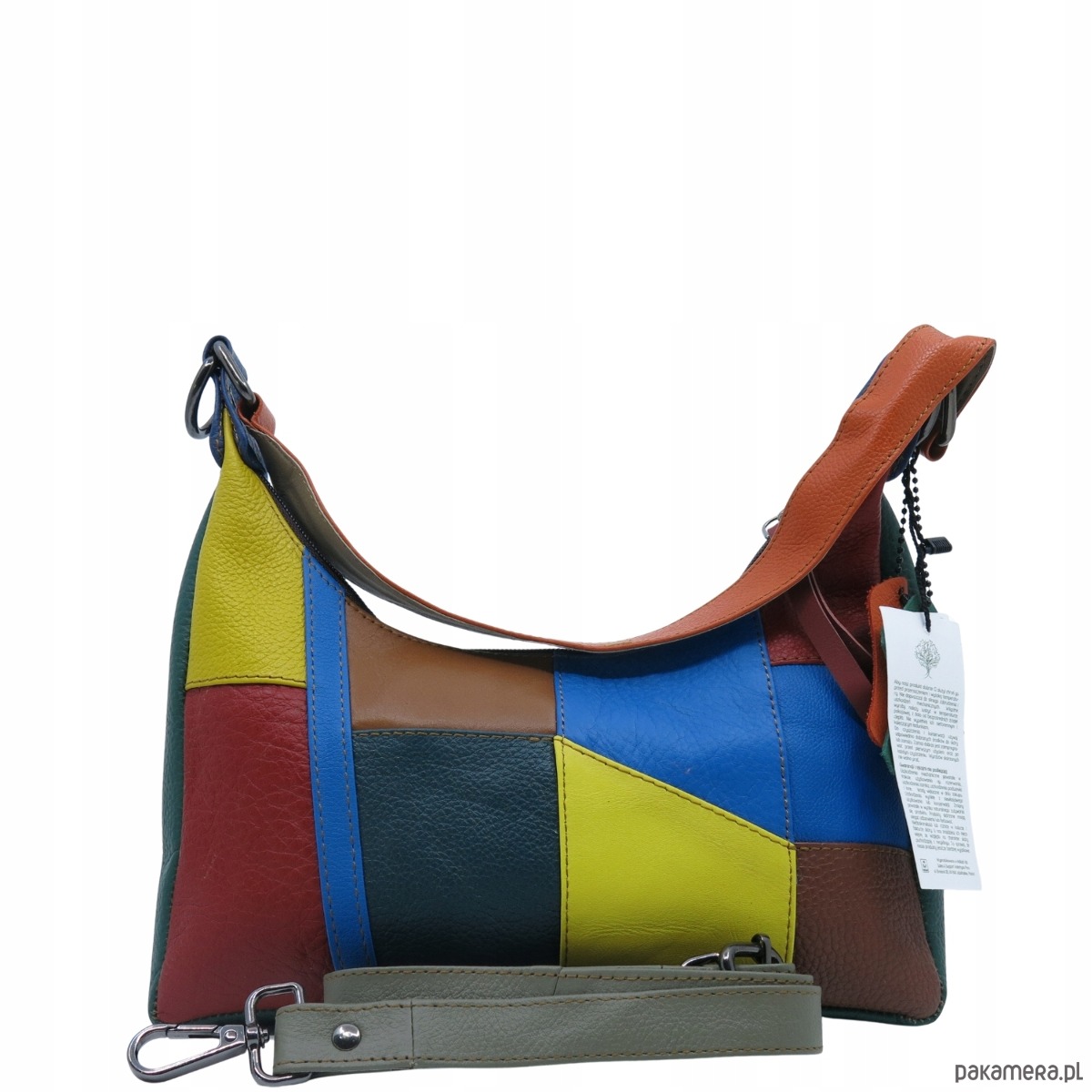 Ta unikalna torebka została uszyta ze starannie dobranych skrawków skóry naturalnej, którym nadaliśmy drugie życie. To, co dla innych mogło być bezużyteczne, u nas staje się pięknym i funkcjonalnym dodatkiem. Każda sztuka jest niepowtarzalna - różnorodne kolory i faktury skóry tworzą wyjątkową mozaikę, która przyciąga wzrok i podkreśla indywidualny styl.