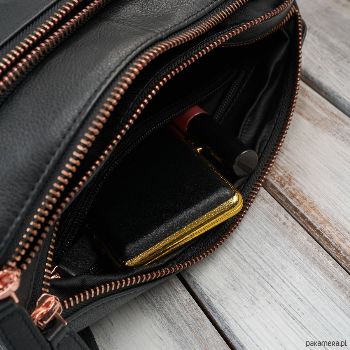 Stylizacje eleganckie i biurowe - czarna skóra i rose gold pięknie uzupełnią koszule, garnitury i klasyczne płaszcze.
