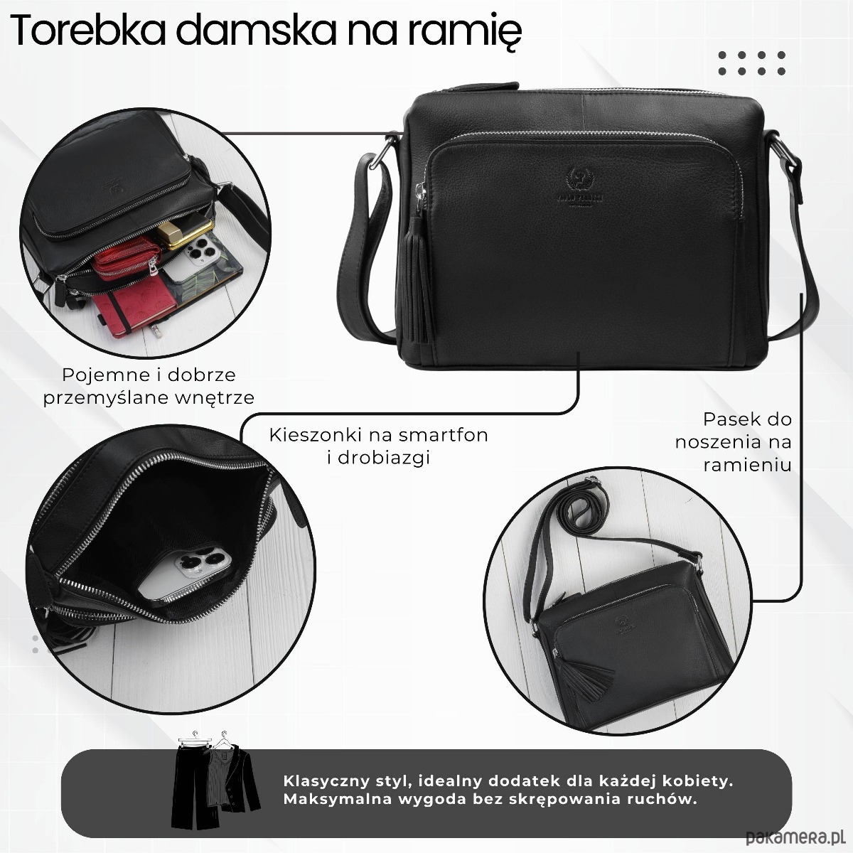 Elegancka torebka damska wykonana z wysokiej jakości naturalnej skóry - teraz w klasycznym czarnym kolorze, który doskonale uzupełni zarówno codzienne, jak i bardziej eleganckie stylizacje. Klasyczna ponadczasowa barwa skóry sprawia, że model ten jest wszechstronny i ponadczasowy, idealny dla kobiet ceniących klasykę z nutą nowoczesności.