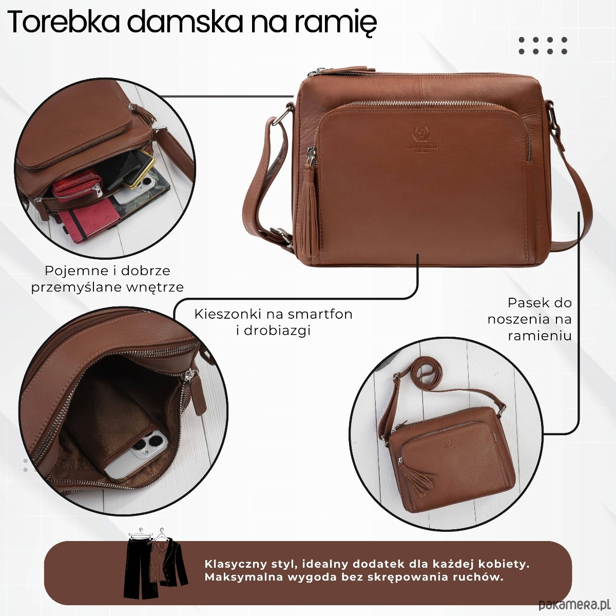 Torebka damska na ramię skórzana koniakowa klasyczna miejska pojemna AY-22-CGS