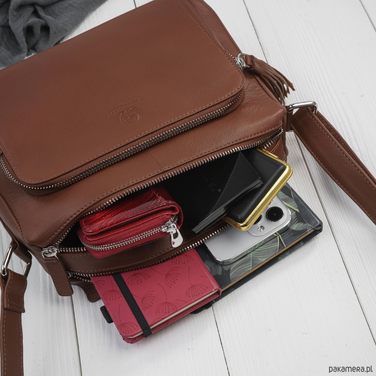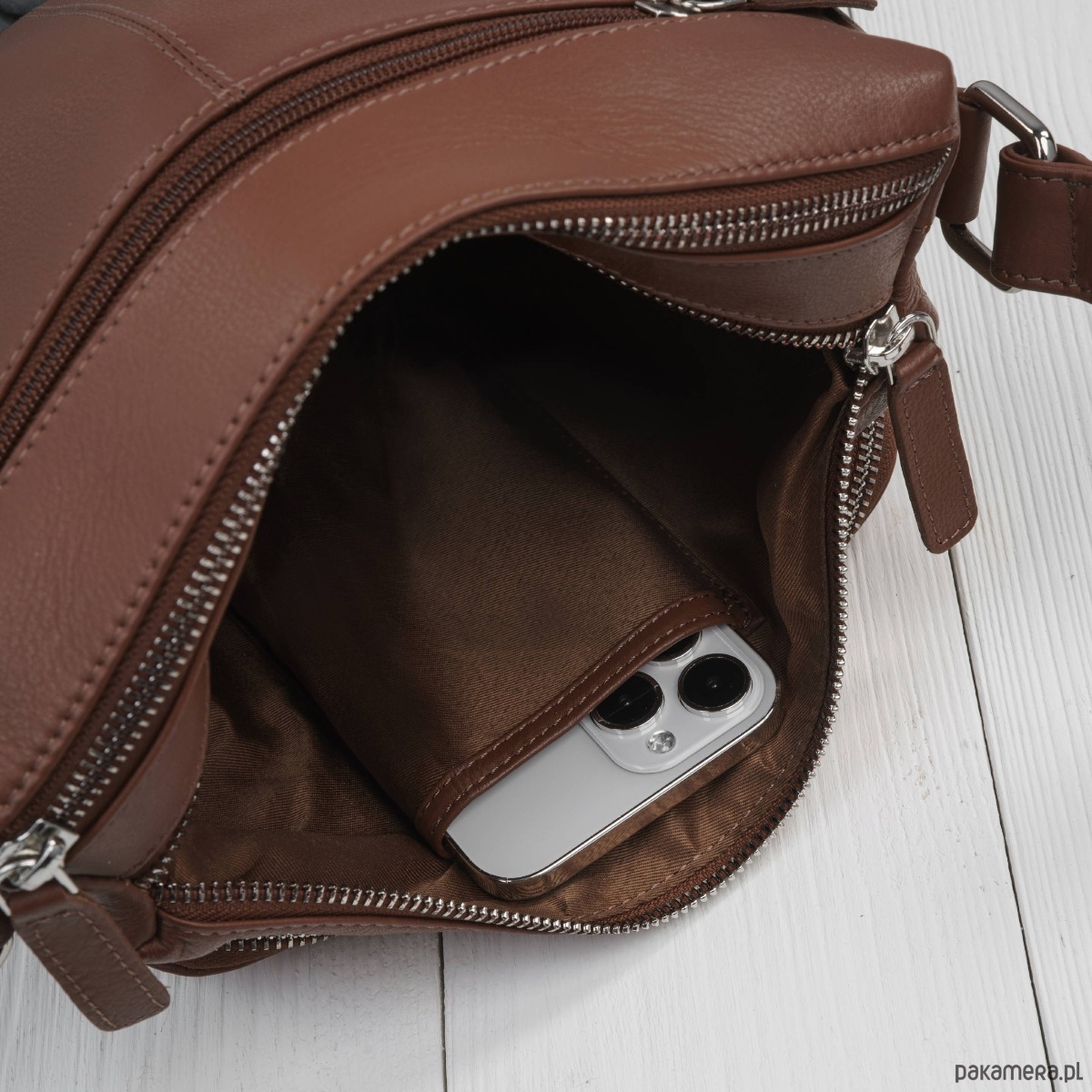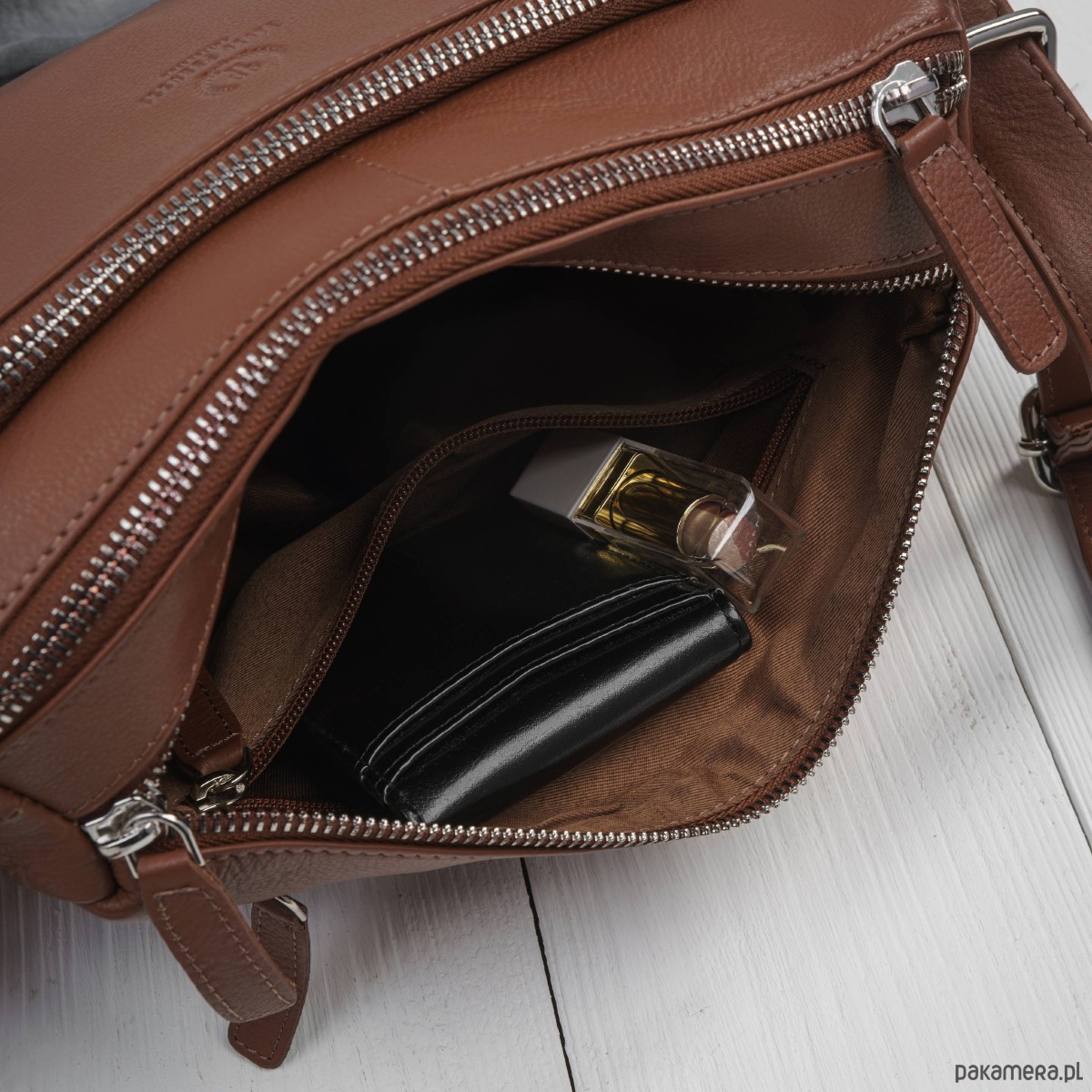 Wykonana z wysokiej jakości naturalnej skóry w szlachetnym koniakowym kolorze, który dodaje ciepła, wyrafinowania i klasy każdej stylizacji, jednocześnie podkreślając jej ponadczasowy charakter. Model ten łączy funkcjonalność z elegancją – idealny dla kobiet ceniących klasyczne dodatki z nutą nowoczesności.