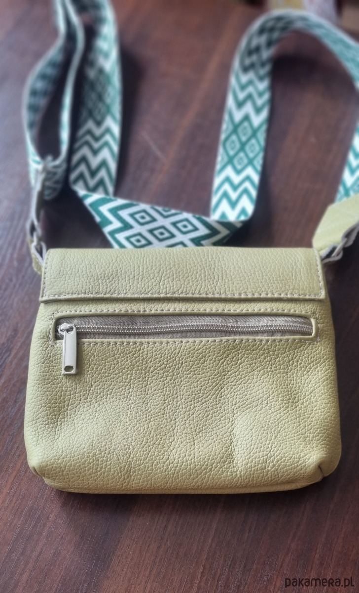Torebka zapinana na magnes, starannie wykończona wysokiej jakości materiałami. W środku znajduje się podszewka, a z tyłu bezpieczna kieszeń na zamek zapewniająca wygodę i bezpieczeństwo przechowywanych rzeczy. Klapka od wewnątrz wykończona dodatkowo skórą, co podkreśla jej ekskluzywny charakter. Regulowany pasek o długości od 85 do 150 cm umożliwia komfortowe noszenie torebki na ramieniu lub na skos (crossbody).