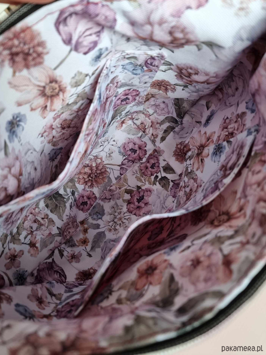 -Funkcjonalne wnętrze: W środku znajdziesz śliczną kwiatową podszewkę, która jest wodoodporna i praktyczna. Dwie otwarte kieszenie pomogą Ci utrzymać porządek w przechowywanych przedmiotach.