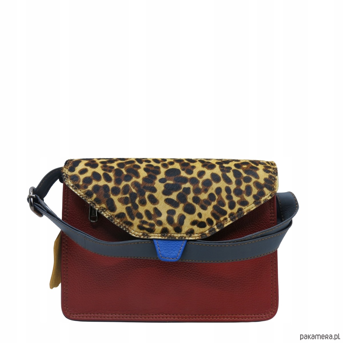 jedna strona klapki ze skóry licowej, druga ze skóry z naturalnym włosiem z nadrukiem