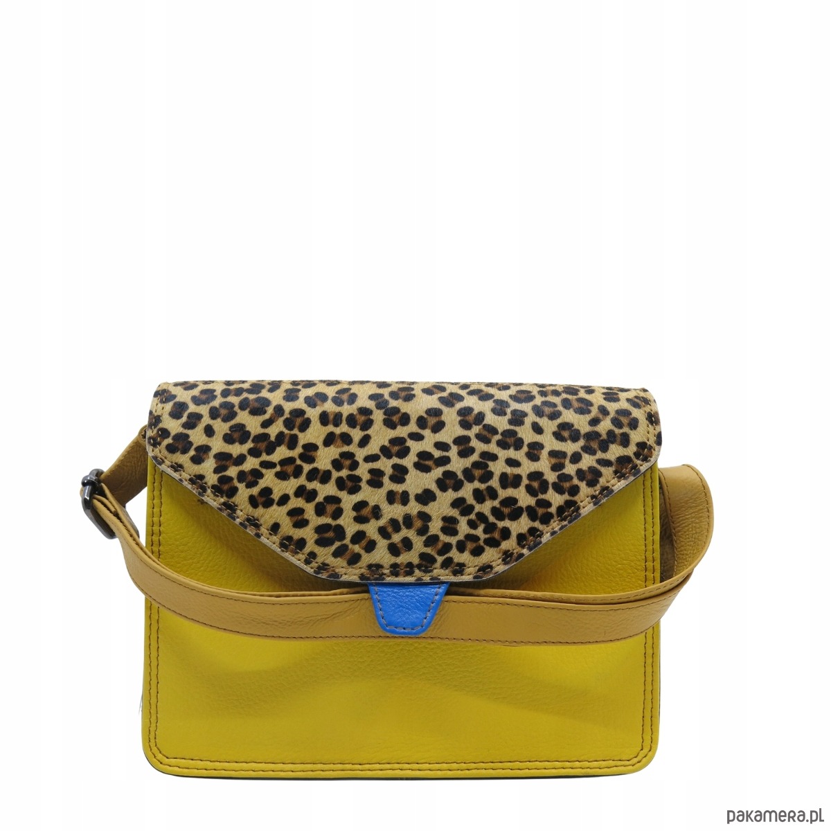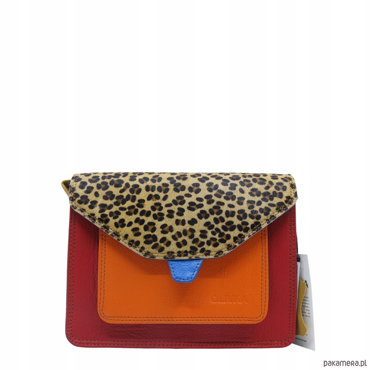 jedna strona klapki ze skóry licowej, druga ze skóry z naturalnym włosiem z nadrukiem
